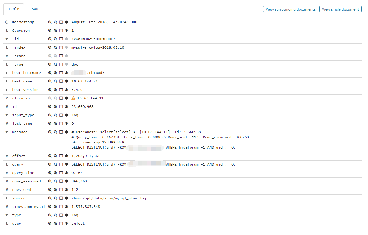 {"@timestamp":"2018-08-07T09:36:00.140Z","beat":{"hostname":"db-7eb166d3","name":"10.63.144.71","version":"5.4.0"},"input_type":"log","message":"# User@Host: select[select] @  [10.63.144.16]  Id: 23460596\n# Query_time: 0.155956  Lock_time: 0.000079 Rows_sent: 112  Rows_examined: 366458\nSET timestamp=1533634557;\nSELECT DISTINCT(uid) FROM common_member WHERE hideforum=-1 AND uid != 0;","offset":1753219021,"source":"/data/slow/mysql_slow.log","type":"log"}