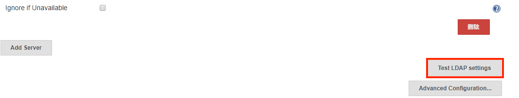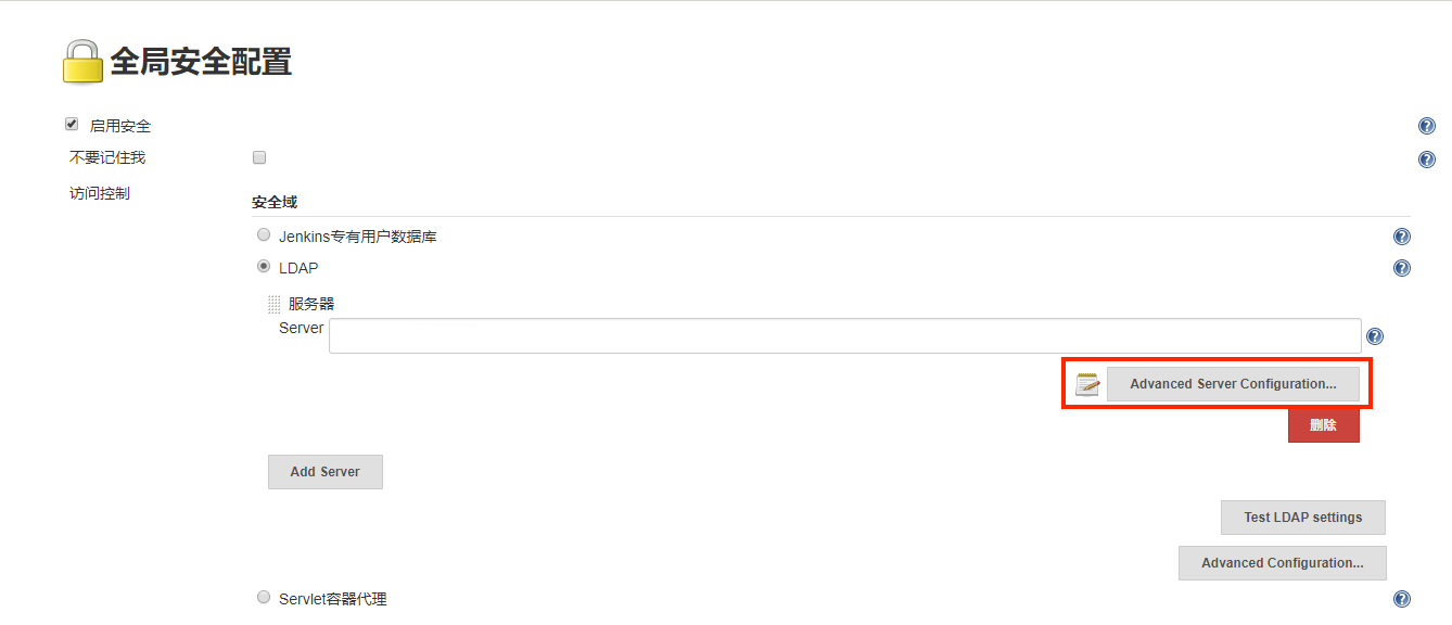 访问控制选择“LDAP”,Server输入LDAP服务器地址,有其他配置可以点击“Advanced Server Configuration...”