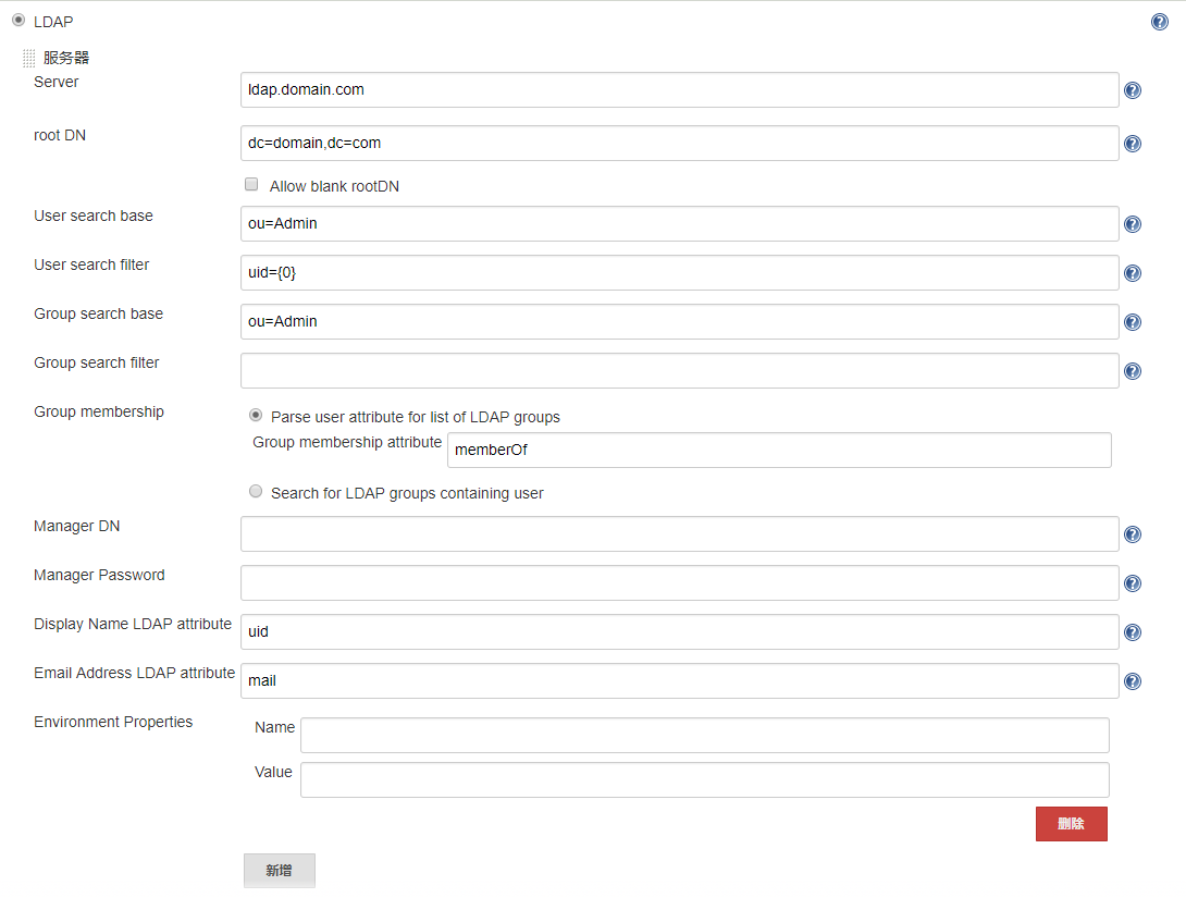 下边还有一些配置如:环境变量Environment Properties、servlet容器代理等,很少用就不多解释了。有一个配置Enable cache可能会用得到,当你的LDAP数据量很大或者LDAP服务器性能较差时,可以开启缓存,配置缓存条数和过期时间,那么在过期时间内新请求优先查找本地缓存认证,认证通过则不会去LDAP服务器请求,以减轻LDAP服务器的压力