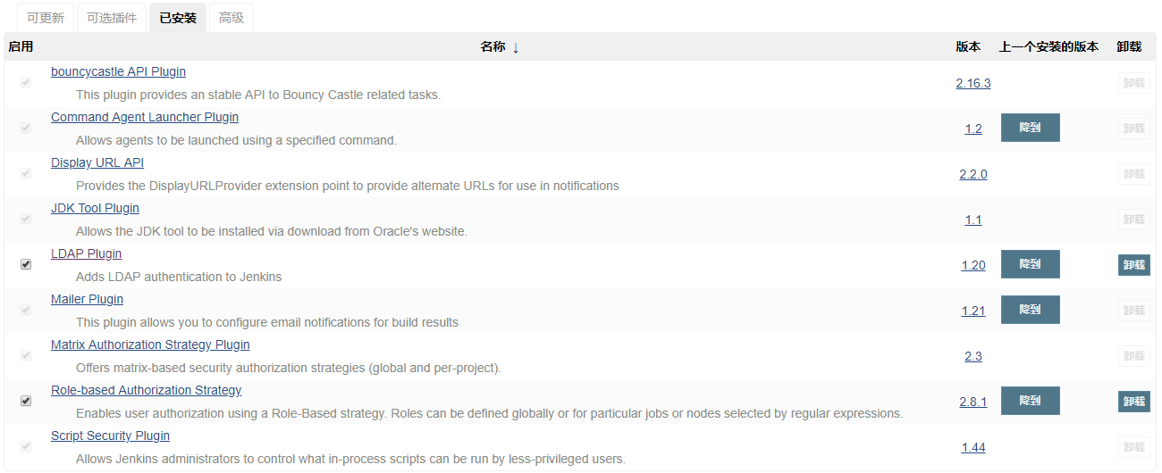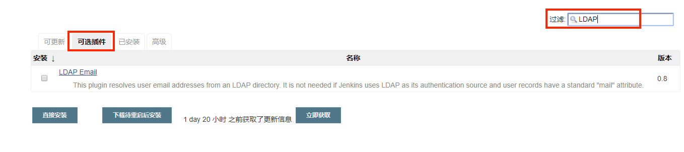 安装方法:登录Jenkins --> 系统管理 --> 插件管理 --> 可选插件 --> 搜索LDAP --> 选中 --> 直接安装 --> 安装完成重启