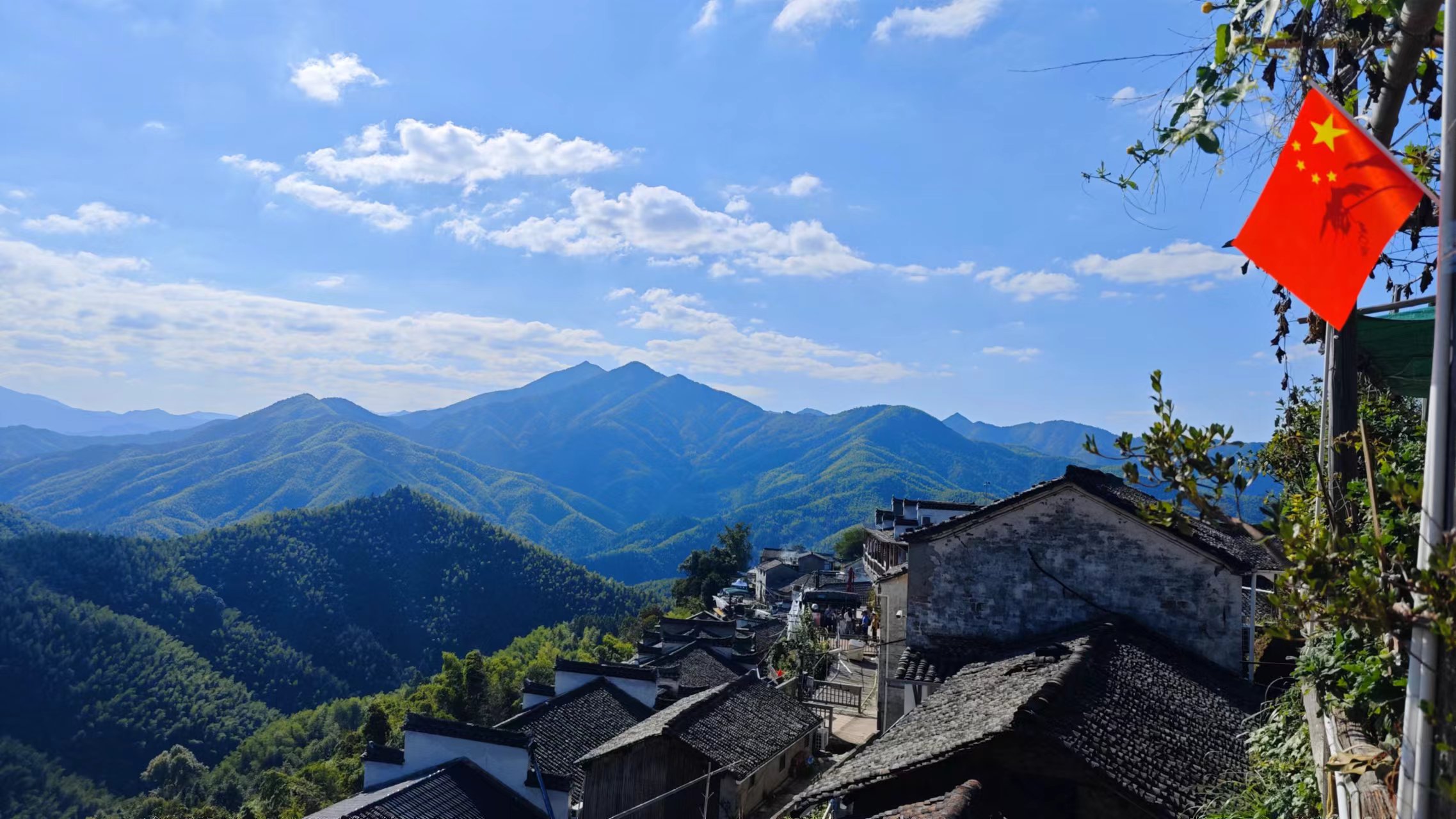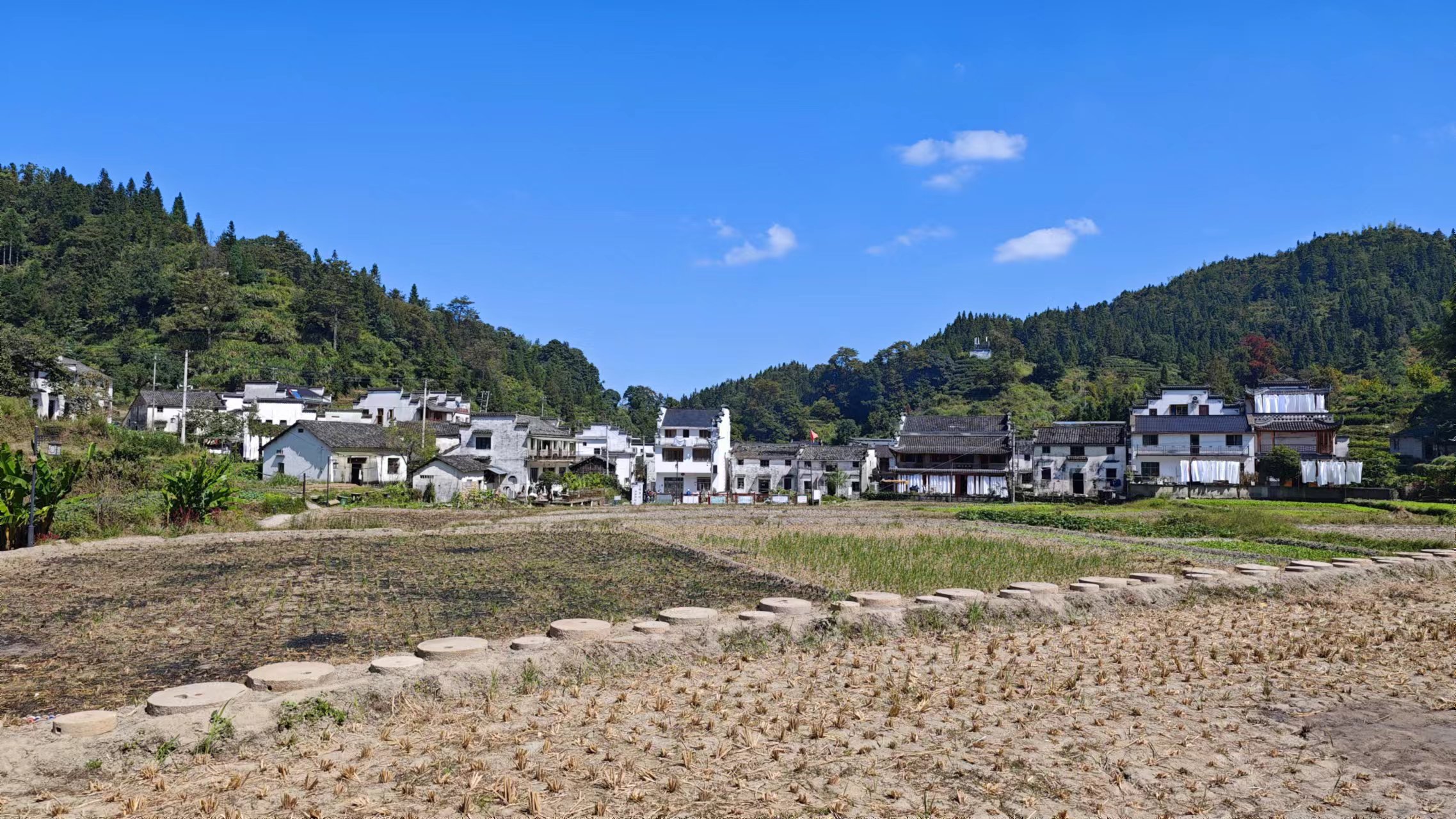 早上起床,煮了粥,煎了之前路过杭州良渚时买的韭菜盒子和手抓饼,饱餐一顿就开启徒步木梨硔的行程,从祖源到木梨硔5公里,全程山路,徒步预计需要1.5小时。天气不错,轻装上阵,背了个包,里边装了两瓶水就出发了,走出村子,回过头来看祖源,白墙黛瓦在蓝天白云和青山绿树的映衬下古朴又好看