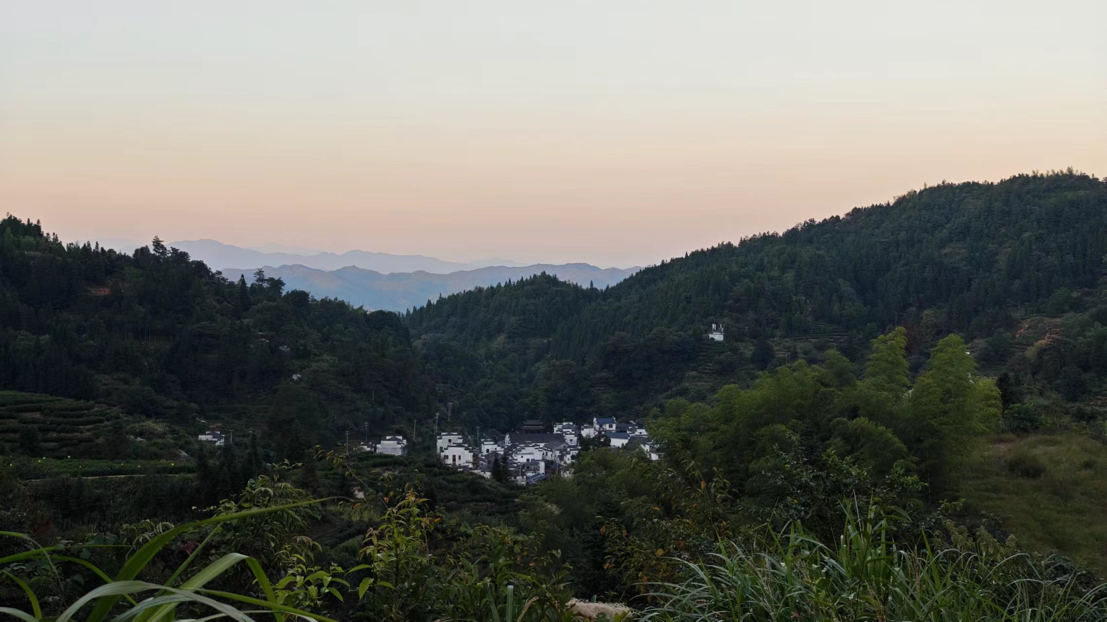 这一段并不全是一路爬坡,祖源出发有过一段爬坡,之后上上下下,相对好走,最后有大约1公里左右是下山,木梨硔不在山顶,而在靠近山顶的山脊上。一个小时多,不到一个半小时,到达木梨硔,进村的地方有两条路,一条通向村子,一条通向观景平台,观景平台在村子对面的山上,能够远眺古村全景,视野极好,特别壮观、好看、漂亮