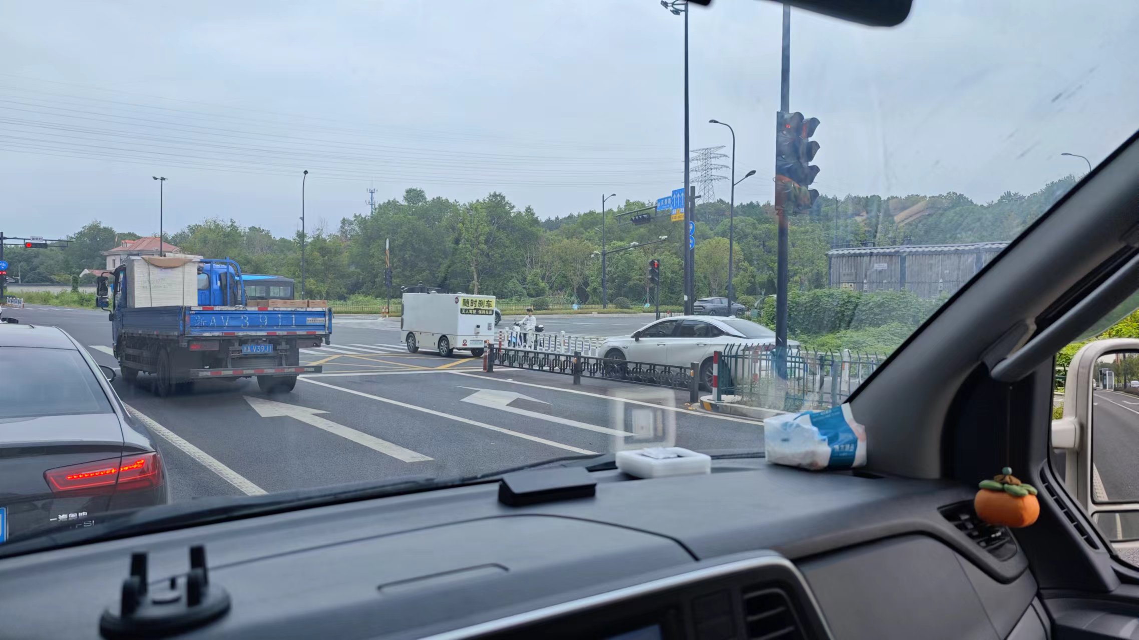 11点钟出发了,目的地黄山屯溪机场,大灰今天飞过来,之前约定我去机场接上他,一起回社区。总路程230公里,依然不走高速,全程国道,预计需要5小时。出发了,杭州还真的走在科技的前沿,路上遇到了无人送货车,跑的还挺快,该停停该走走,短短一段路,遇到了好几辆。科技发展真快,大家伙都在调侃失业了去铁人三项,但这无人驾驶的飞速发展,已经严重挤压铁人三项的工作空间,我们还是考虑另谋出路吧