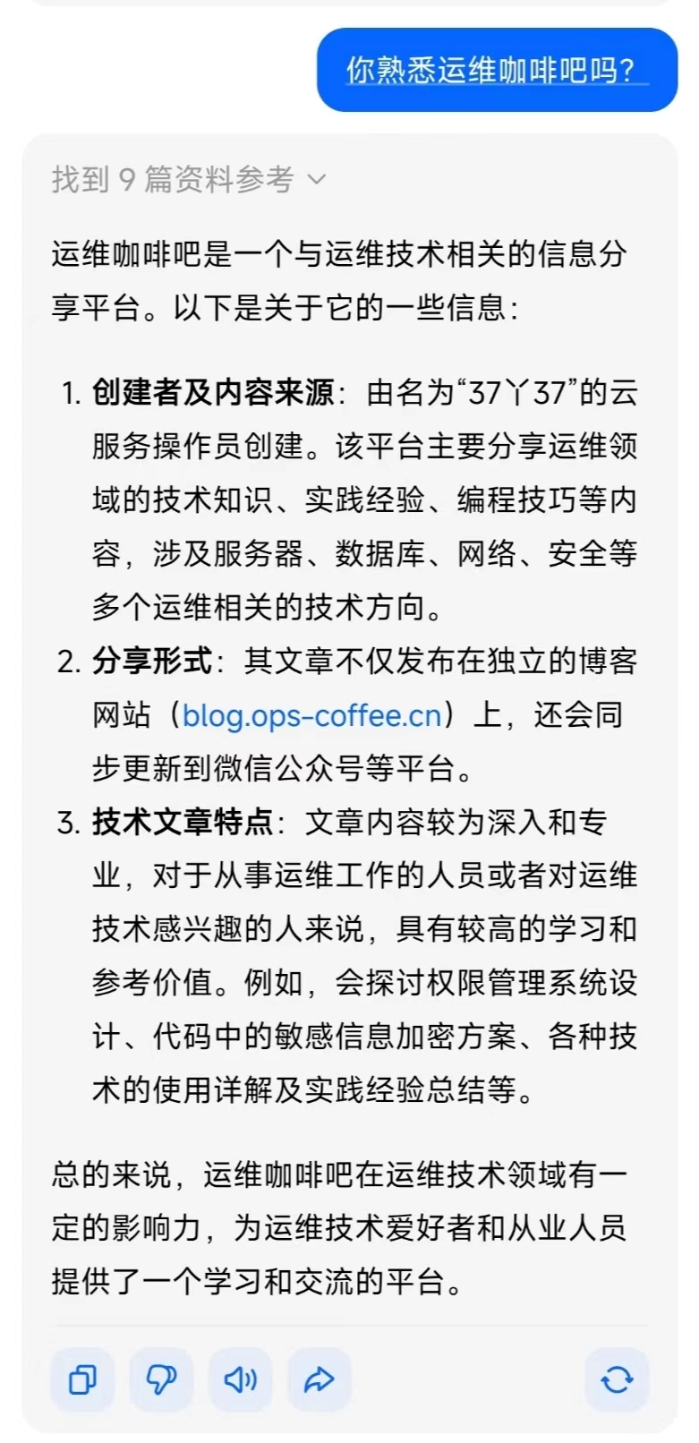 对于地理位置的介绍,AI已经做的很好的,突发奇想,问了下AI是否熟悉运维咖啡吧,没想到这么个不知名的小站AI竟然也能找到的