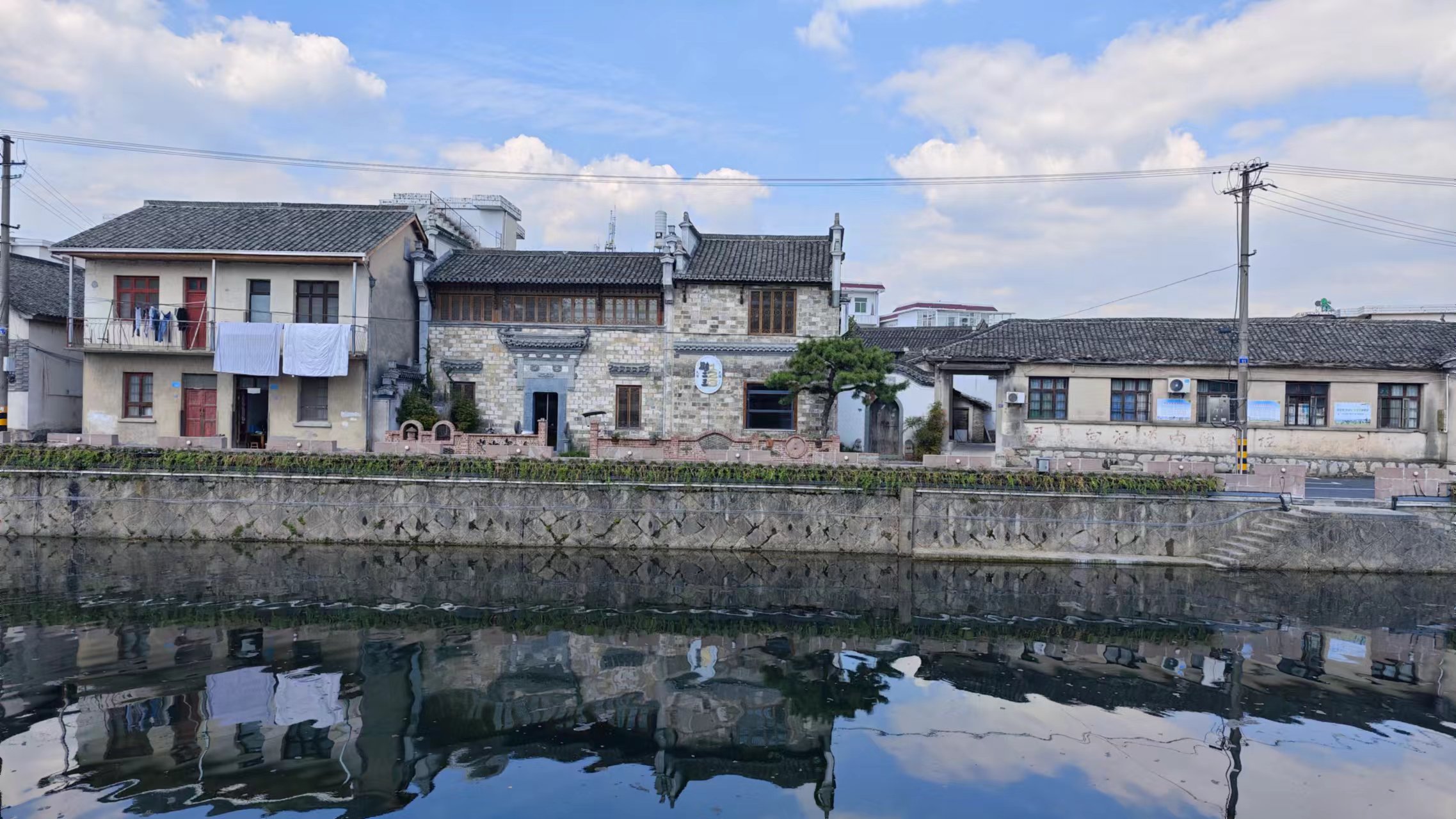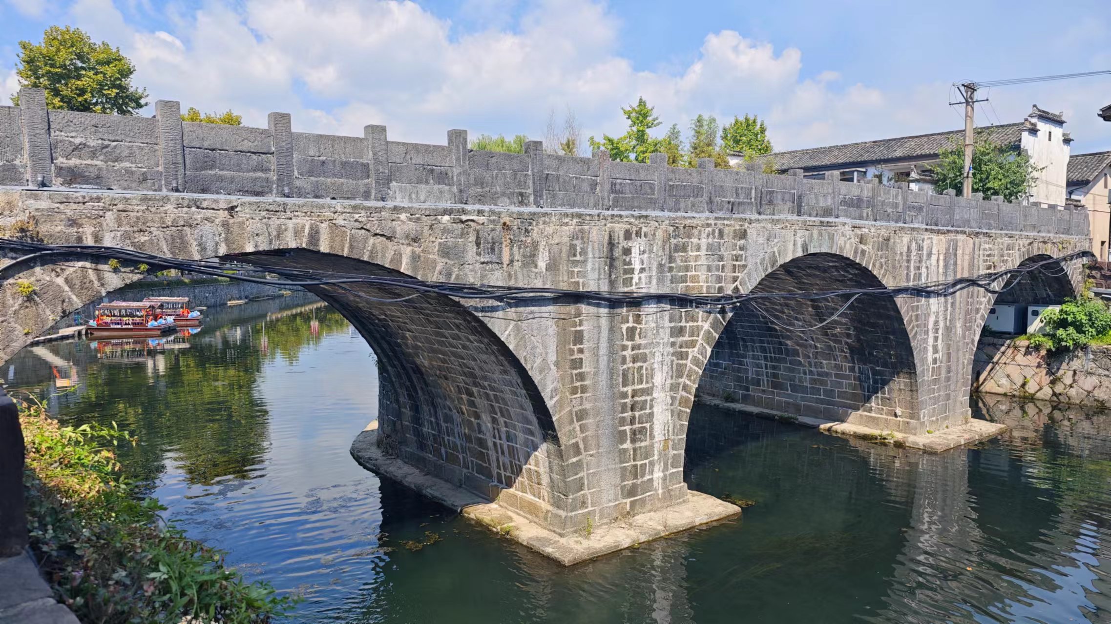 黟县NCC社区就在黟县古城的对面,隔漳河与黟县古城相望,由通济桥与黟县古城连通。通济桥取通畅济世之意,始建于南宋淳熙五年,后被冲毁,又在清乾隆年间重修。南北走向,上水为西,下水为东,三孔石拱桥,桥面两侧有带石柱石条栏板,两桥头各有22级台阶。通济桥东西两侧不太一样,吸取了之前被冲毁的经验,西侧桥墩伸出桥体并削成尖状,利于分水