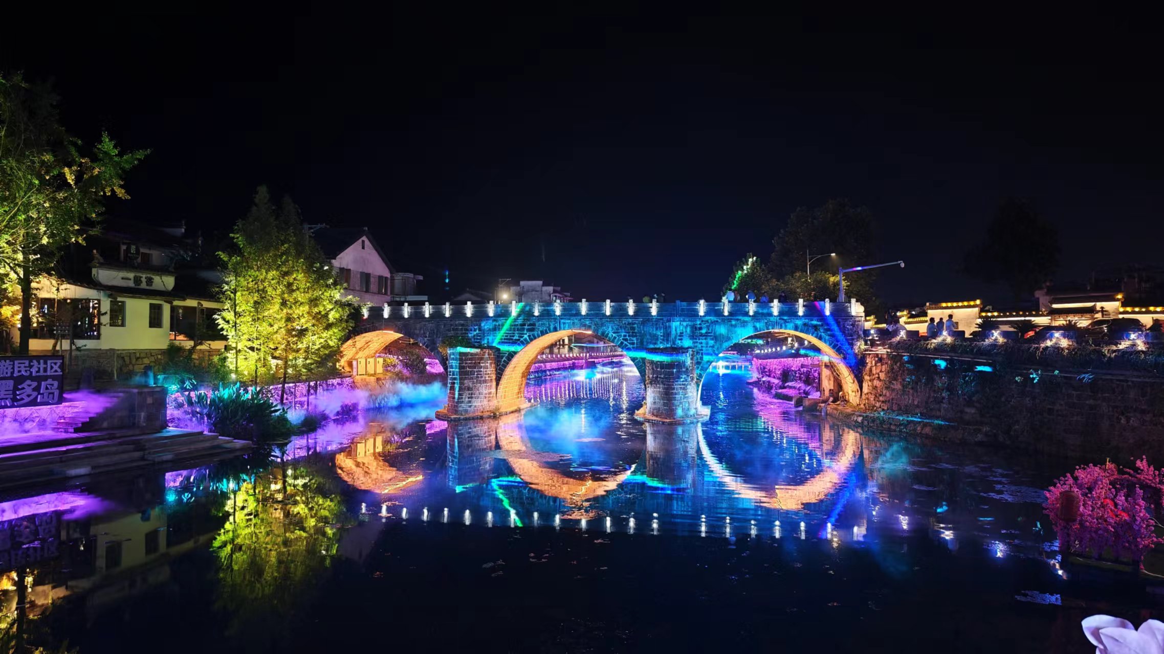 吃完饭接着city-walk,看看晚上的黟县小城,明显晚上比白天热闹多了,古城内到处亮起了花灯,有一种元宵节闹花灯的感觉,古街上的人也明显的多了很多,基本都是当地居民,也是老年人居多,很热情,我就简单的问了个问题,就拉着我讲了很多。旁边的漳河到了晚上也完全变成了另外一种景象,红红绿绿的灯光照射,还有水雾喷出覆盖河面,很魔幻