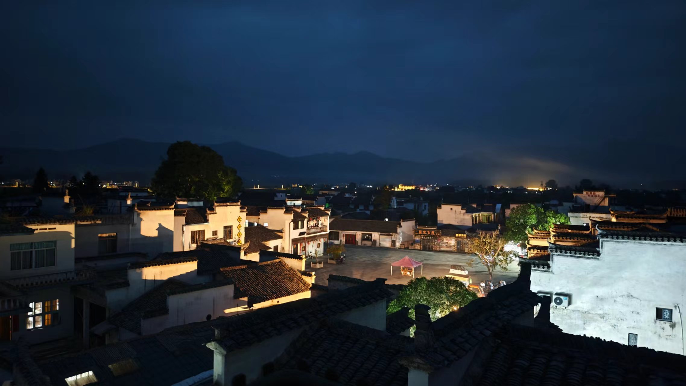 一直待到晚上,太阳下山,夜幕降临,楼顶没有灯,下去了,门口遇到了老板娘,老板娘惊讶于我竟然还在,一个人在上边待了那么久,跟老板娘聊了聊,看上去她年龄不是很大,但儿子也只比我小一岁,孙子比我儿子还要大上两岁,之前饭店是儿子搭理,估计是生意不好,现在已经搬到了县城,还同样经营饭店。我很不好意思,在这待了这么久,也没有消费,那就帮她宣传一下吧,她们家的店名叫“徽涩记忆”,叶氏支堂旁边很好找,饭菜味道我不知道如何,但楼顶的风景是真的好