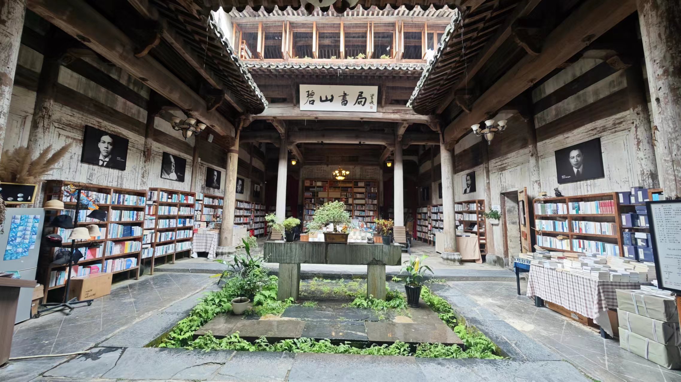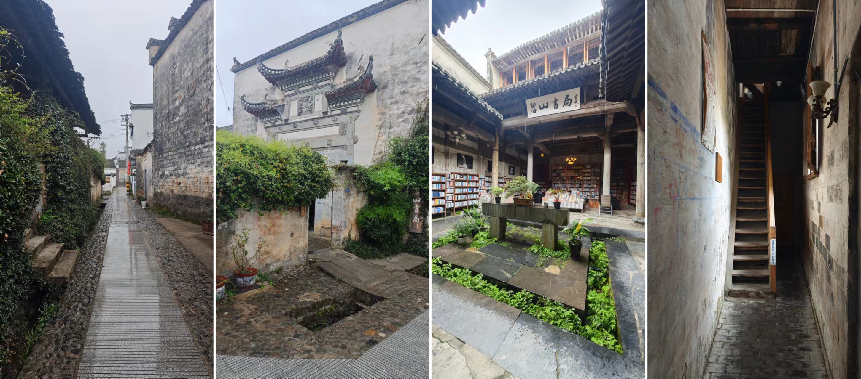 吃完早餐,雨还未停,去碧山书局吧,那里环境应该不错,看看书,处理下消息。从村口小卖部走到碧山书局也就几分钟,一两百米的距离。正在下雨,刚走进碧山书局,就很惊喜,除了古朴的风格外,还头一次看到了“四水归堂”的真实演绎。“四水归堂” 中的“四水”指的是屋面的雨水,“归堂”意思是雨水汇集到建筑的堂屋前,主要是指四合院形式的建筑,屋顶呈坡面,从四周向中间倾斜,在中间形成一个天井,下雨时,雨水顺着屋顶坡面流向天井,仿佛四方之水汇聚而来。在中国传统风水观念中,“四水归堂” 被认为是一种聚财的象征,水在风水中代表着财富,雨水汇聚到堂前象征着四方之财汇聚到家中。文化在这一刻有了具象