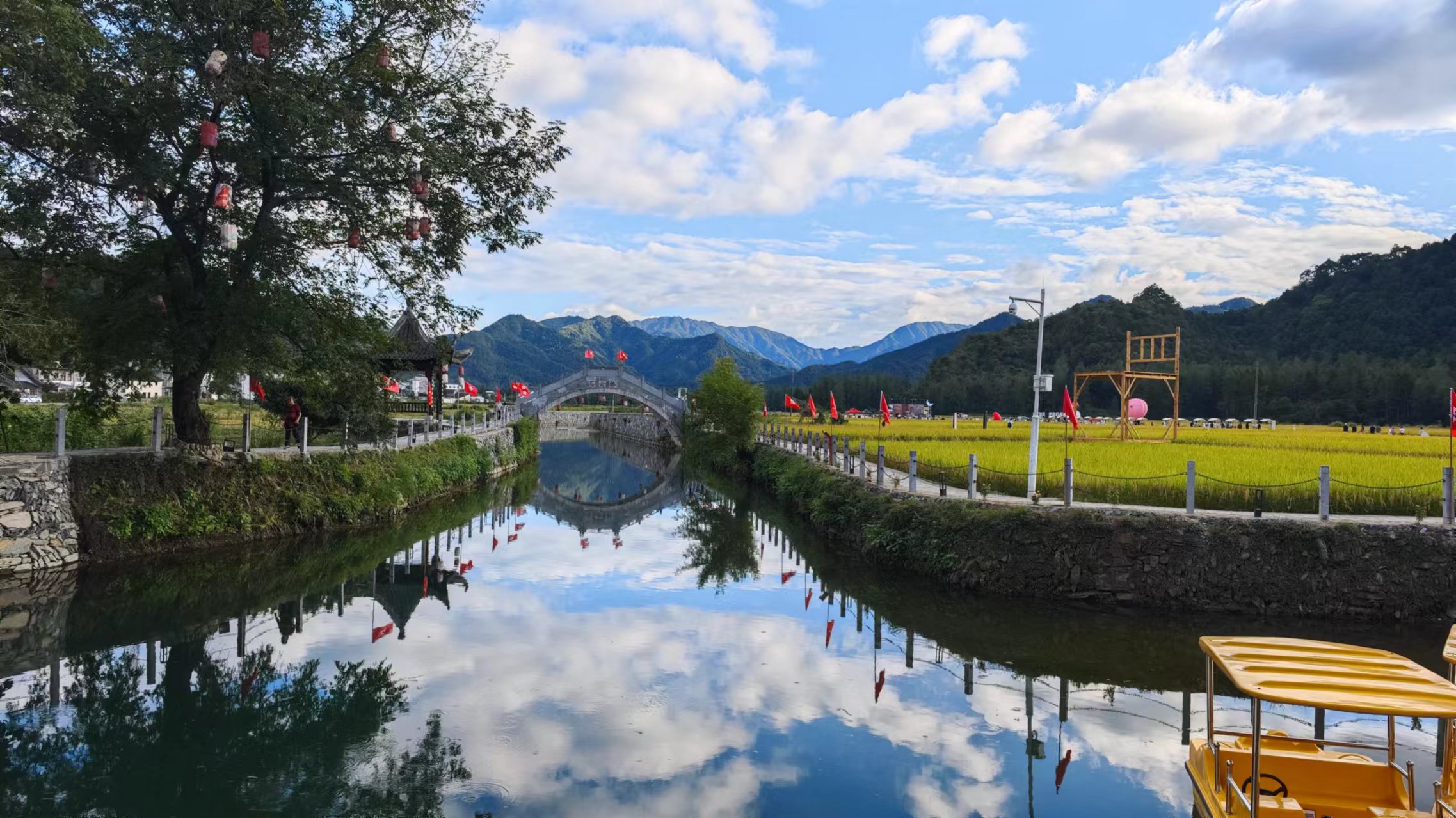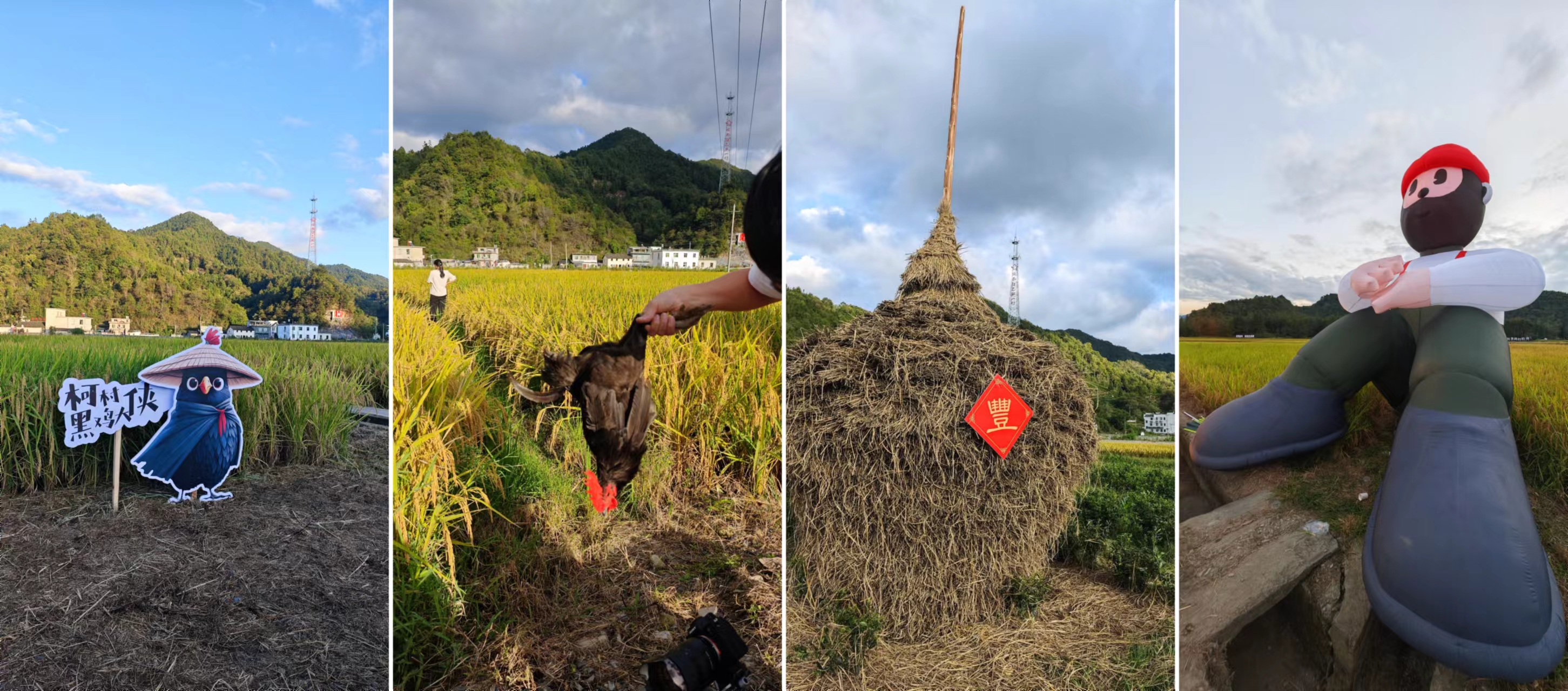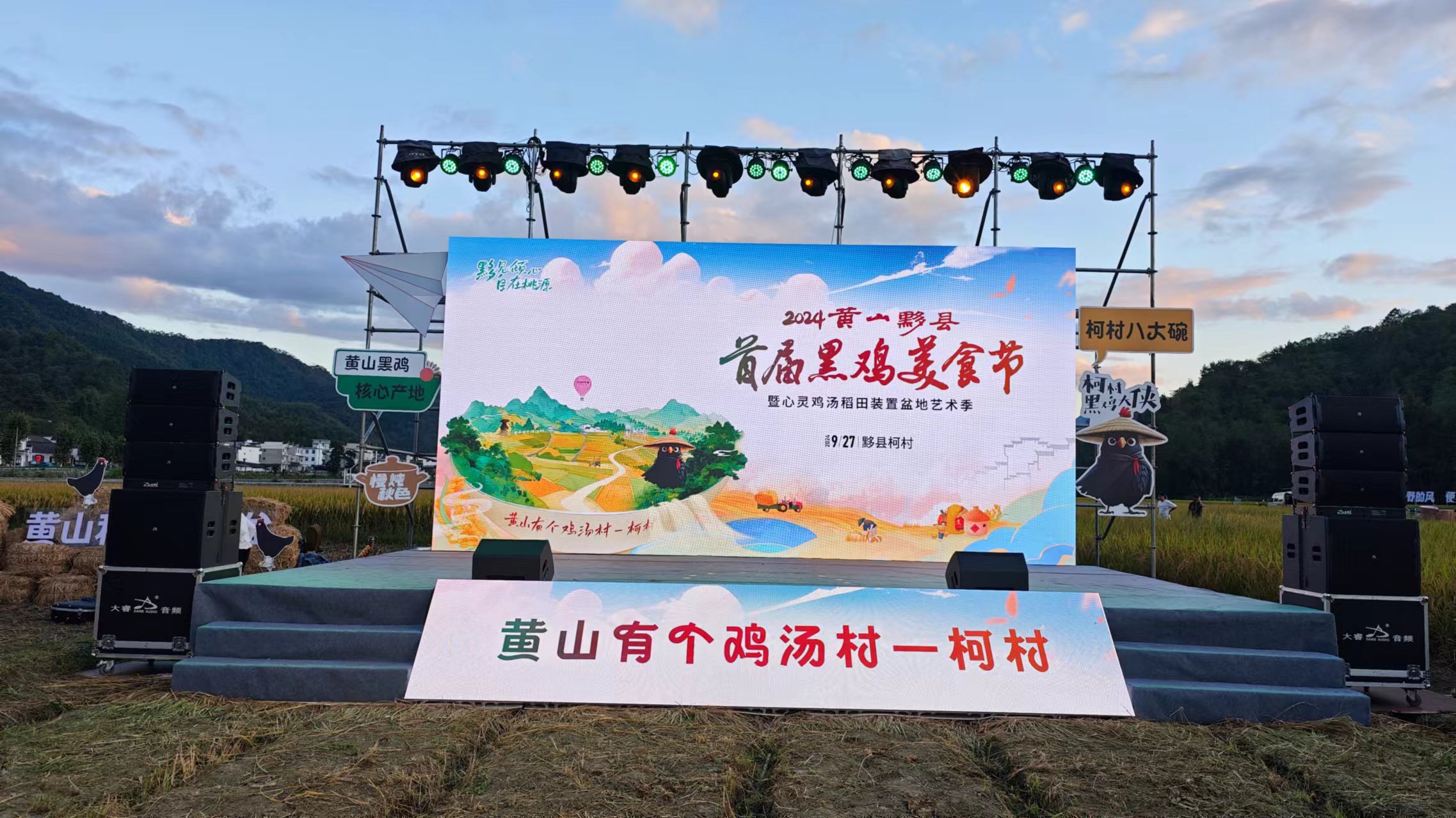 今天正在这里举行一个活动:2024黄山黟县首届黑鸡美食节暨心灵鸡汤稻田装置盆地艺术季在柯村,NCC是受邀嘉宾,而我主要是来蹭吃蹭玩儿的,活动的主会场设置一片稻田里,周围都是即将成熟的水稻,接地气。听镇长介绍想通过这次黑鸡美食节,打造集美食展示、产业推介、乡村旅游、艺术创作、心灵疗愈等为一体的产业联动活动,以产品带产业,以产业赋能乡村振兴。在黟县的这几天让我对皖南的感受有了很大的改观,看的出来每个村子都在做一些年轻的事情,想要有所发展,这个我觉得特别棒,好多年没认真体验下老家的乡村了,不知道是否也有类似的做法以谋求发展