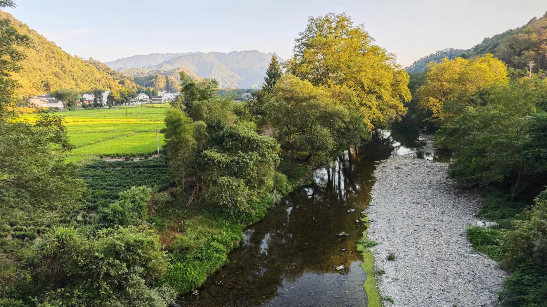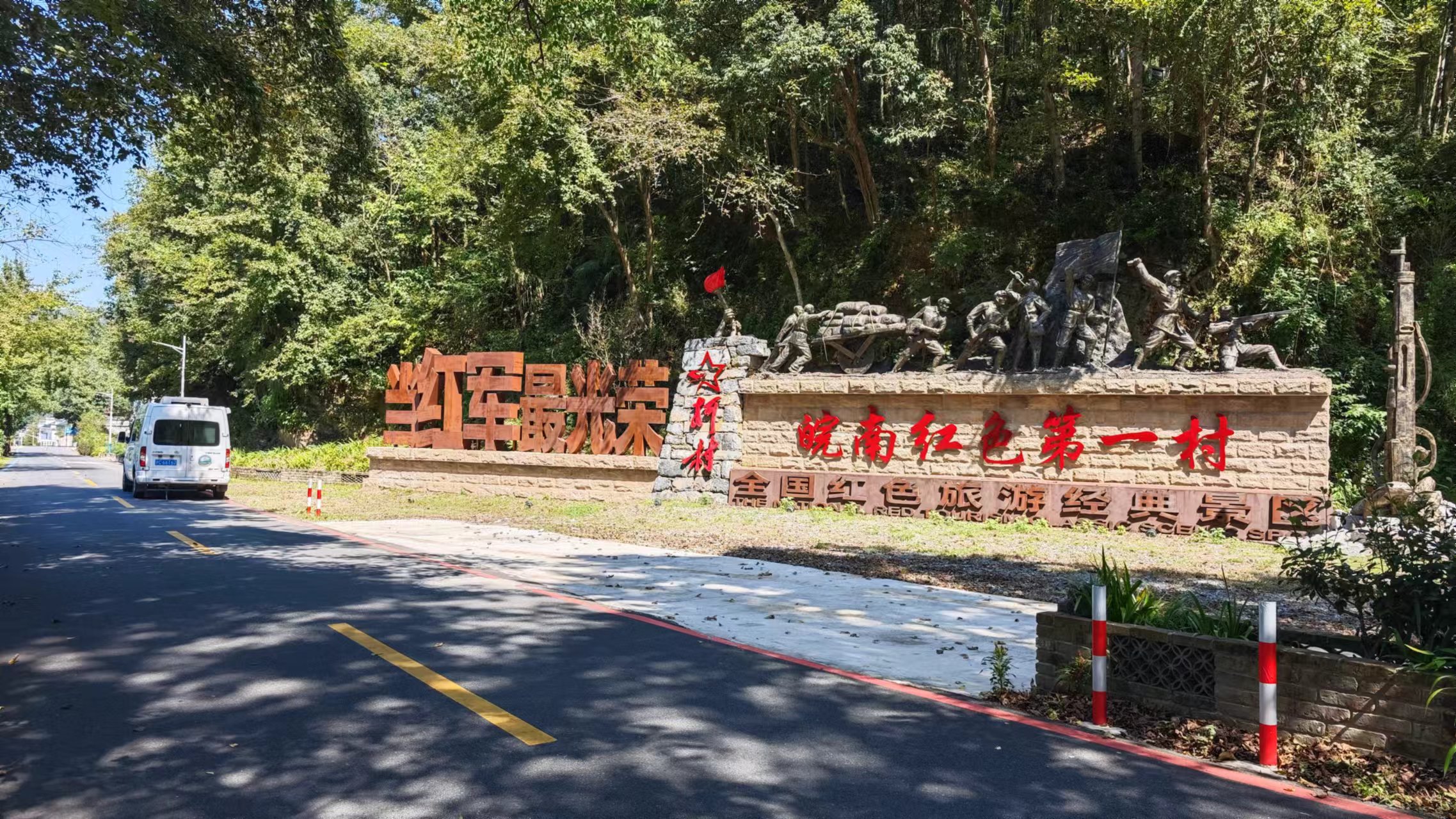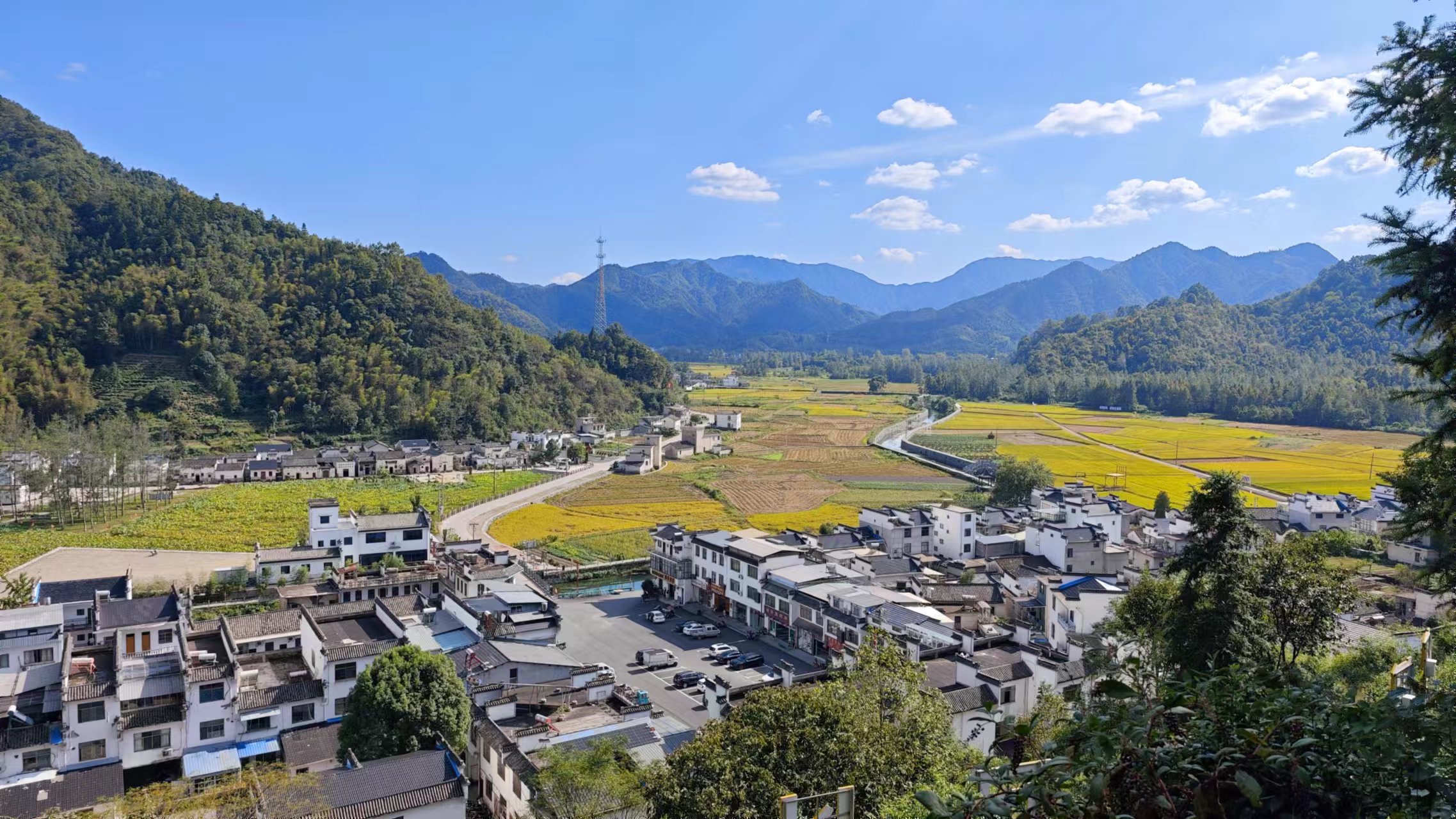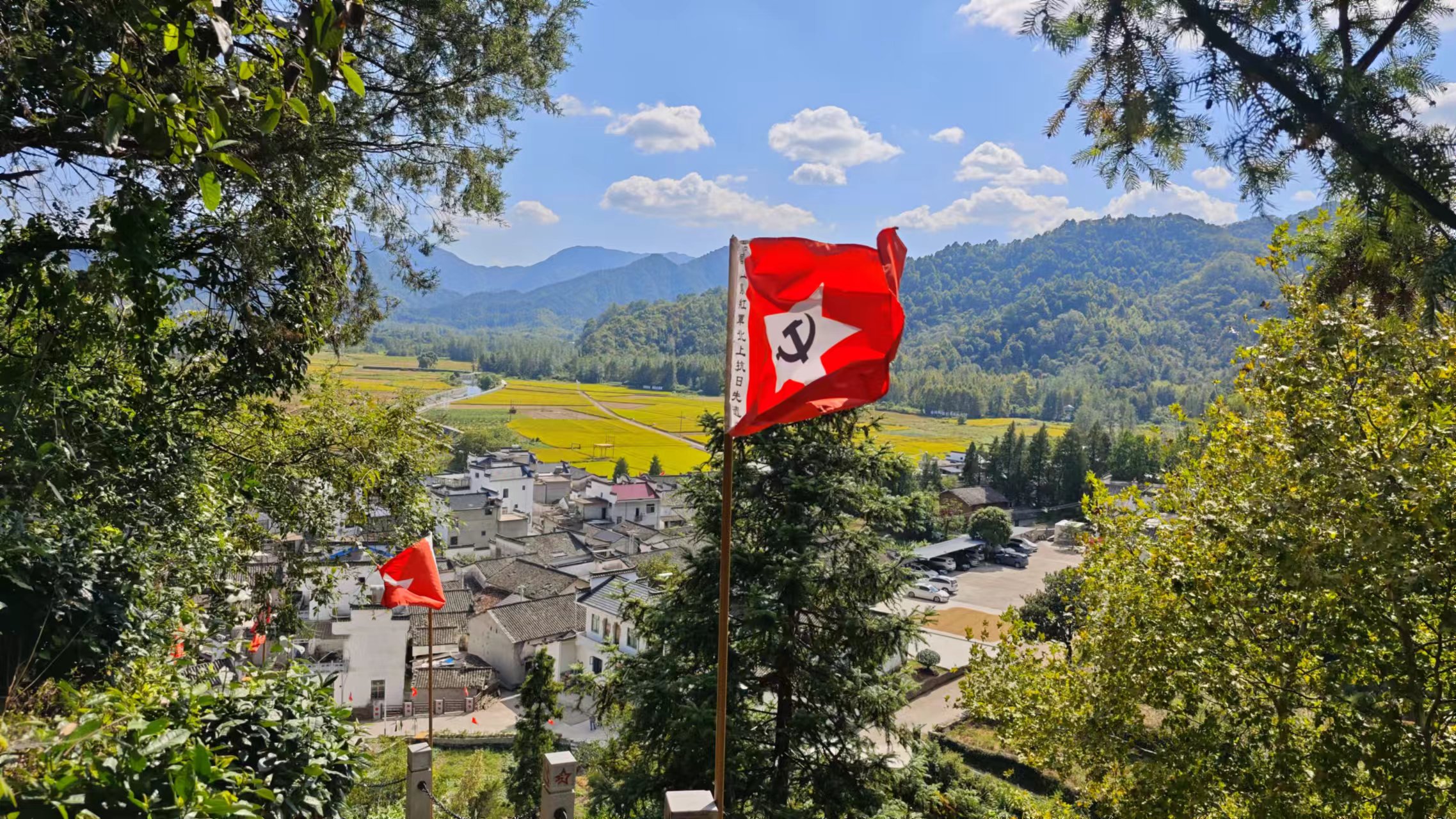 文章整理完成,太阳已经出来,准备下山了,去仔细逛逛柯村村,从观景台到下山的这段路,右侧靠山,而左侧则视野开阔,能看到柯村镇,大片金黄的稻田,配上白墙灰瓦的徽派民居也很好看,沿途有几个观景台,可以停下来观景拍照。下至山底,进入柯村之前先看到了大大的皖南红色第一村的牌子,很耀眼