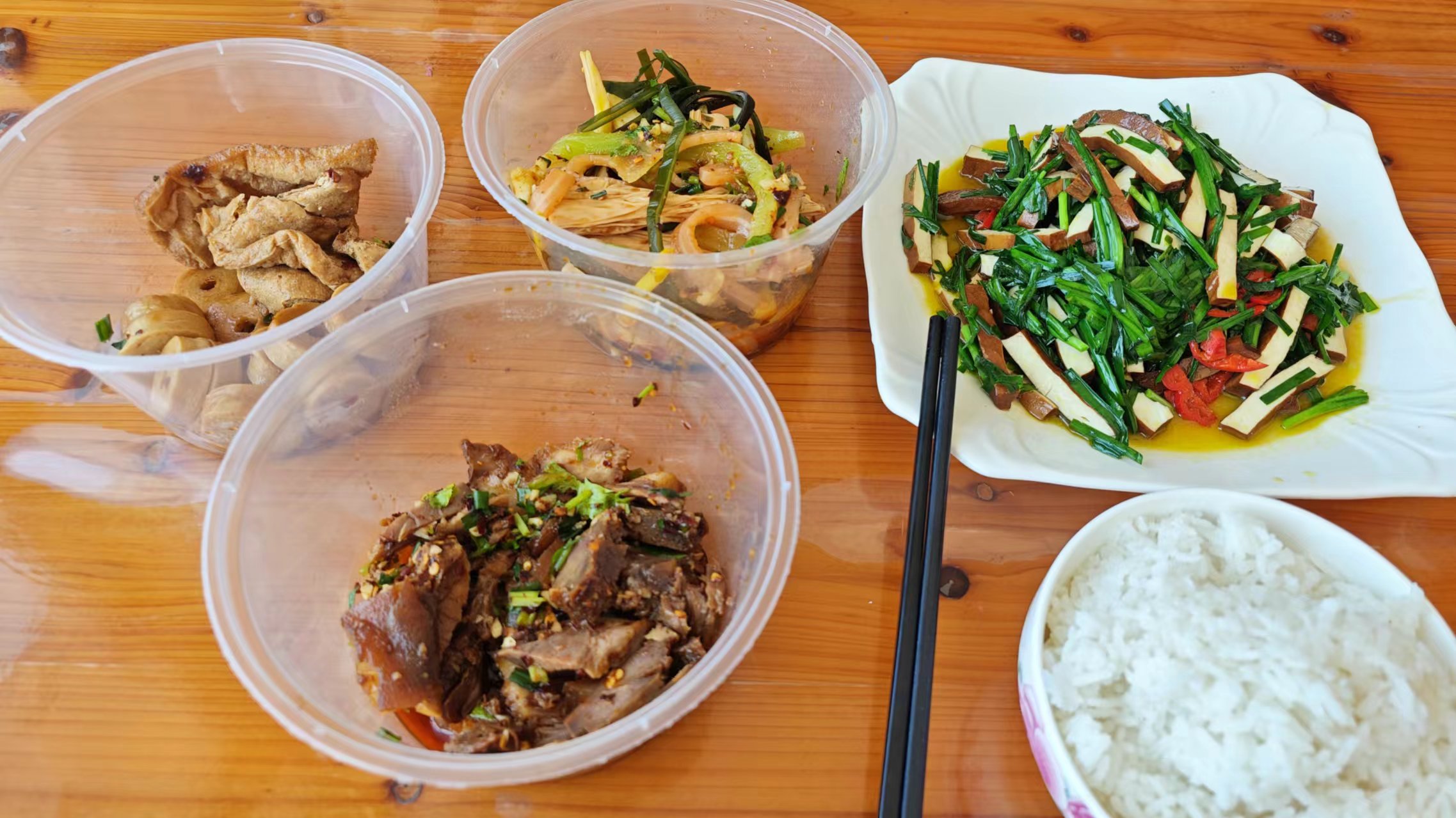 直接把车开到柯村镇人民政府门口,一片很大的停车场停车,围绕这个停车场两边有一些商铺,先绕着简单的转了一圈,右侧有条街,很短,街上看到了一家卖卤菜的店,卤菜是我的最爱,停下来买点,猪头肉、凉拌菜还有一个豆制品,点的都不多,总共20块钱,这个做下酒菜最好,但开车不能喝酒,作罢,旁边的饭店点了个韭菜炒香干,25元,不算便宜,我一个人,大小四个菜,特别丰盛的午餐,开始正式逛之前先填饱肚子,吃饱了才有力气好好逛