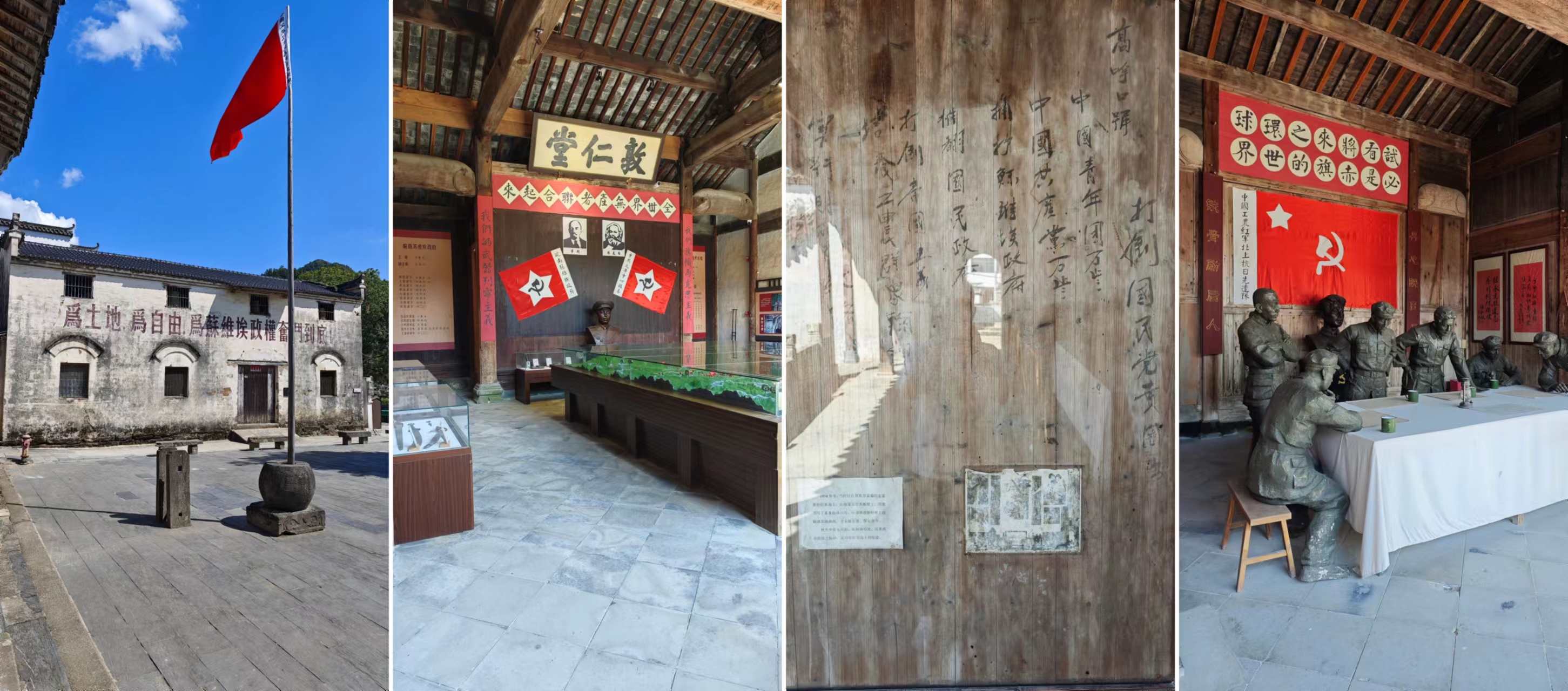 在街道的另一边坐落着柯氏宗祠,柯氏宗祠建于清顺治年间,门前有一个广场,广场上对称地摆放着两只石旗礅,高大的门楼,石质的门坊,门上柯氏宗祠牌匾,两侧一对抱鼓石,前檐两侧的木栅栏,使宗祠显得庄严肃穆。柯氏宗祠是当年皖南苏维埃政府所在地,现辟为皖南苏维埃政府旧址、柯村暴动纪念馆,记录了柯村暴动前后的那段峥嵘岁月,中午时分,没有其他游客,就我一个人,仔仔细细的把所有的介绍都看了一遍,让我记忆深刻的是墙壁上展示了一块木板,木板上书写了多条标语口号,推翻国民政府、打倒帝国主义之类的,类似口号在电视上看到很多,但实际中还真的未遇到,我原以为是为了展览效果后期制作的,但看下方介绍,这块木板是当年红军战士写下的原迹,此刻电视场景也有了具体的呈现