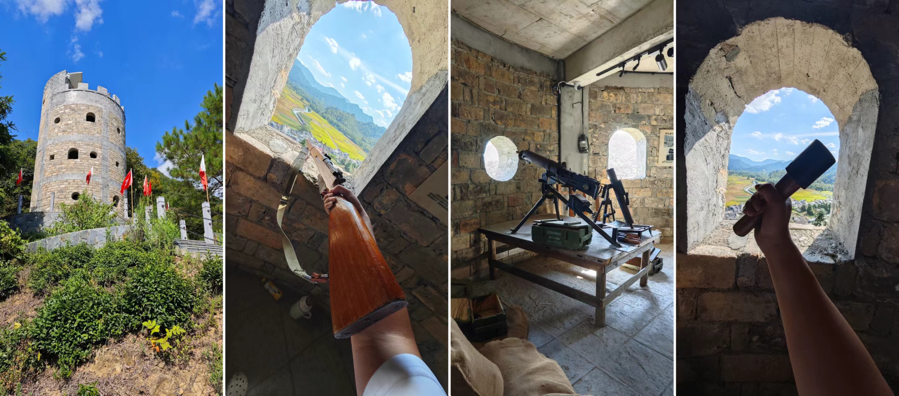 碉堡的位置不是很高,大概十多分钟就能爬上来,据说原来这里就有碉堡,但是坍塌了,现在这个是在原址之上重建的,共四层,一二层都是空的,墙壁上有一些介绍碉堡的介绍外,没有其他的陈设,三层则有一些战时的场景重现,机关枪、迫击炮、手雷、钢枪之类的道具,一个人也没有,连管理员都没有,可以拿起来拍个照