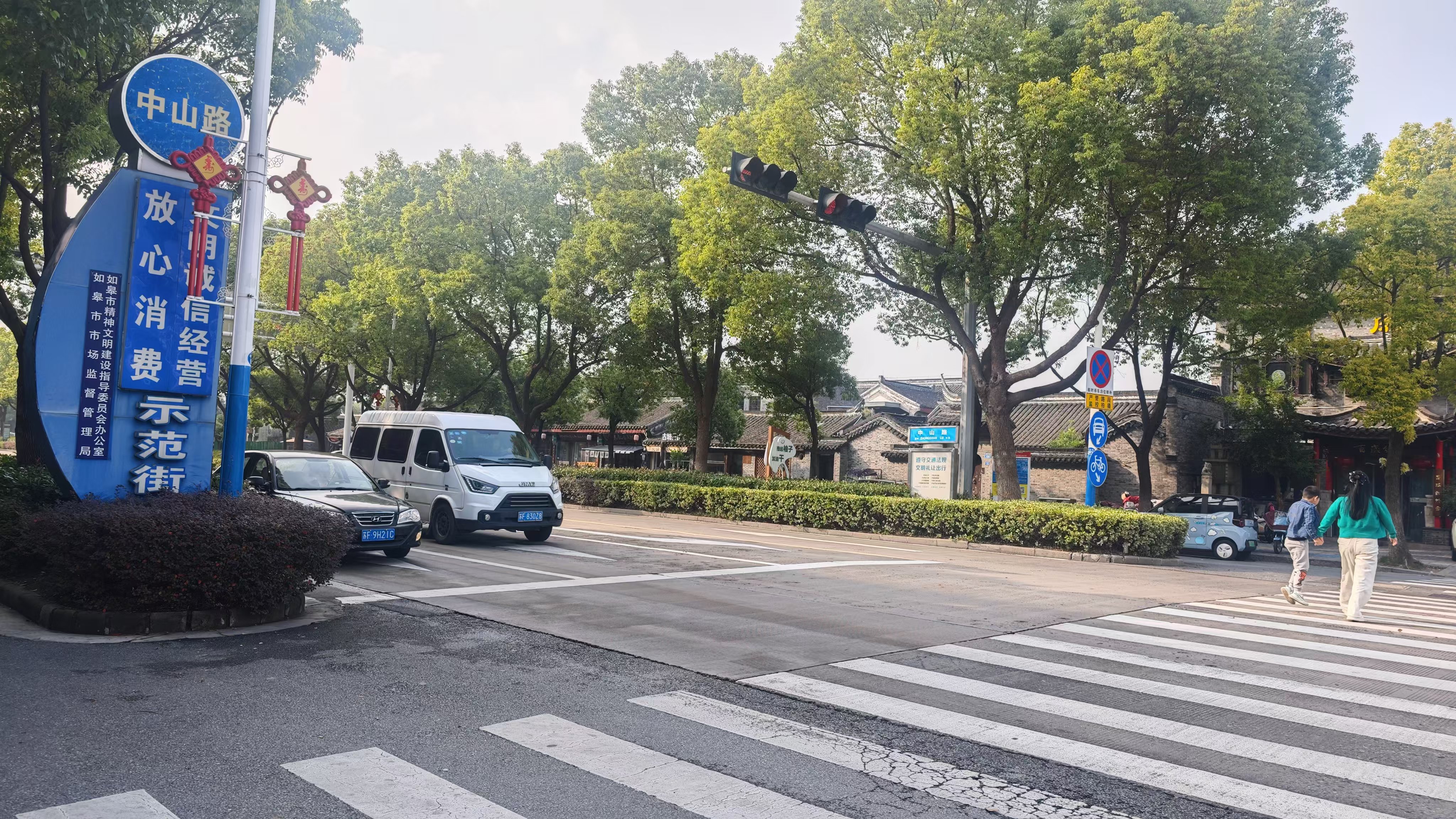 上海距离如皋只有两百公里左右的距离,虽然不远,但这一路并不好走,常常堵车,要三个多小时,周六自然醒,起床就出发。出去玩儿自然是开心的,路上即便是堵一点,问题也不大,老婆儿子聊聊天,也挺有趣的。到如皋已经中午,先吃饭,网上找了一家德盛斋,看评价还不错,直接导航到德盛斋水绘园店,想着吃完饭可以直接逛逛水绘园,临近终点路边全是停车位,停车很方便,停好车去吃饭,走到路口看到文明诚信经营放心消费的牌子,陡增好感