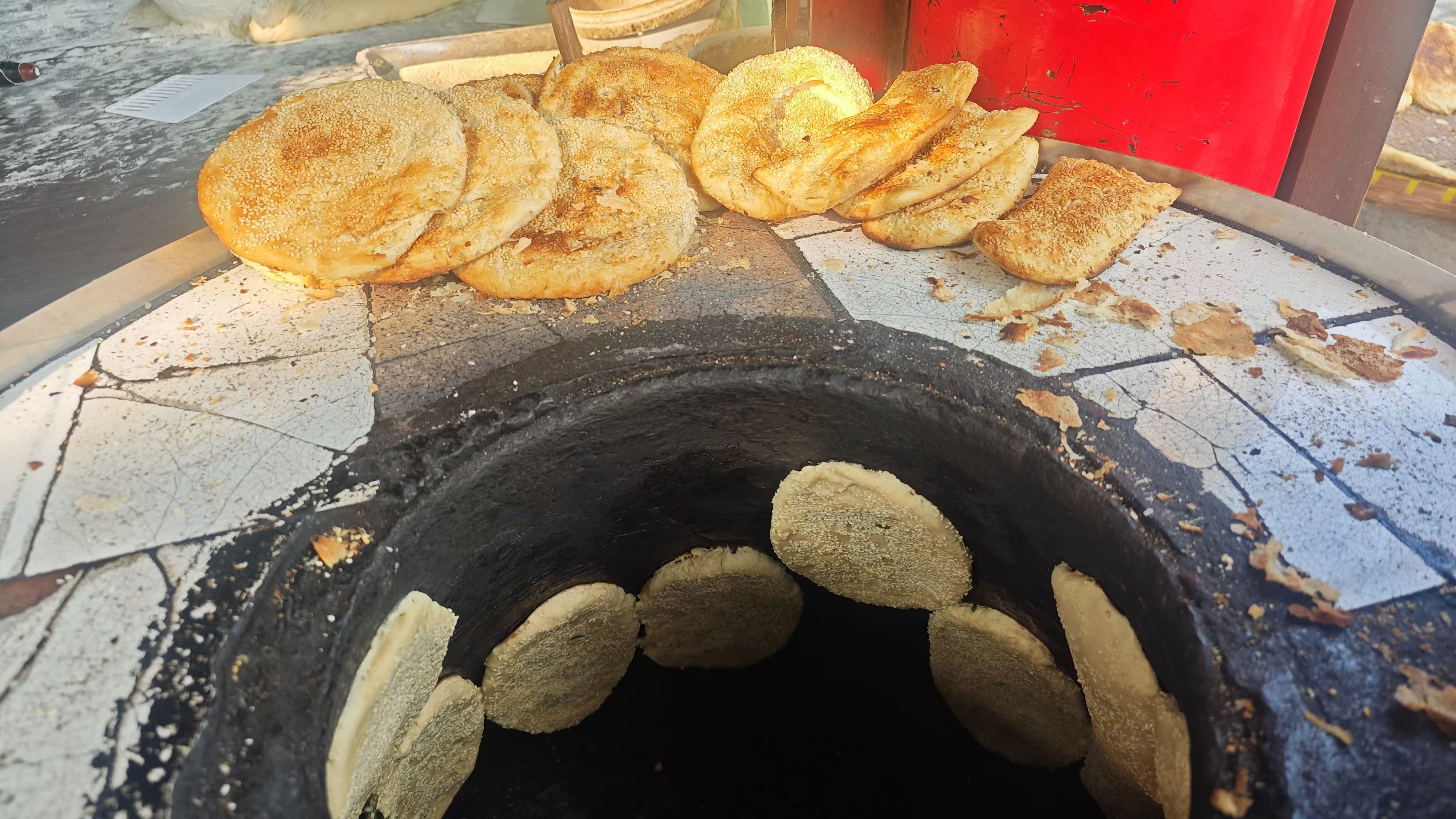 就在街对面,有一家卖烧饼的老店,先买两个烧饼吃,去年在南通吃到的烧饼味道不错,烧饼似乎也是这里的特色美食,现烤现吃,外皮酥脆,内里柔软,味道不错,有很多不同的口味,价格也都不同,按自己的喜好购买即可,个头很大,一个烧饼直接吃饱