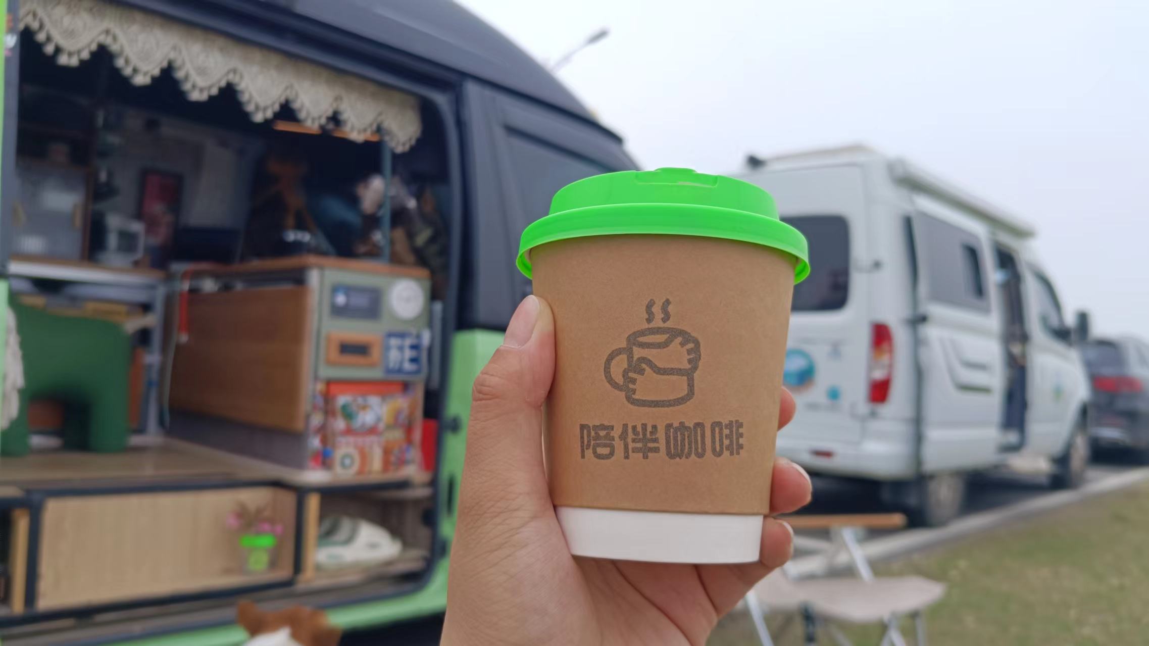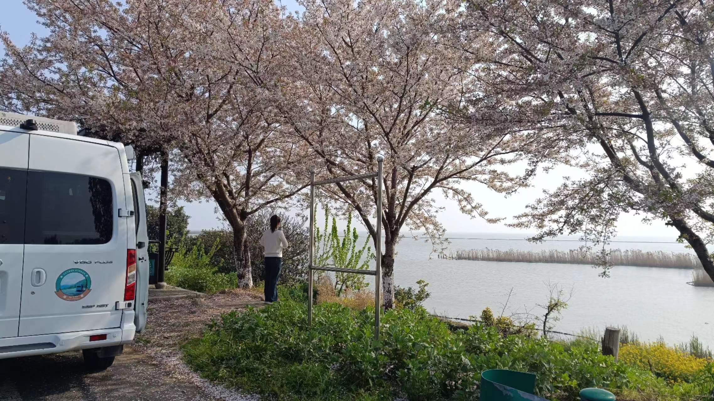 再往前经过网红打卡地湖与Cafe,天气不好就不打卡了,缓缓行驶在湖边道路上,看金黄的油菜花,绿油油的草地,赏心悦目,每隔几百米就能遇到一个湖边露营的,这里确实是露营绝佳地。乌云逐渐散去,天气开始晴朗,行至静山夕阳观景处,看路边有辆很漂亮的咖啡车,于是停车休息。几分钟前一阵大风,把车主的遮阳篷给吹坏了,车主正在发愁如何处理,我车子上正好有工具,帮车主把损坏的遮阳篷给拆了下来,折腾了半天,我帮车主处理问题,车主请我喝咖啡,跟车主聊了下,95年,编导工作,苏州上班,自己动手改的咖啡车,平常上班,周末假日出来摆摊,这生活态度和状态着实令我羡慕不已