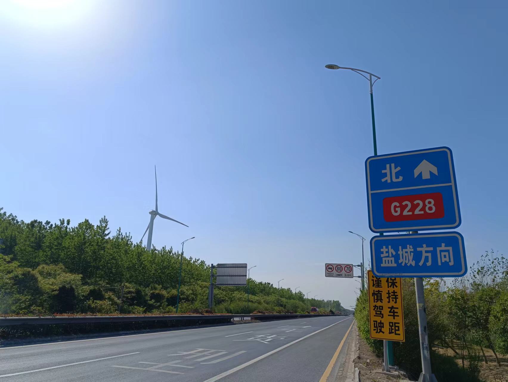 国道228始于辽宁省丹东市,止于广西省东兴市,一路沿东部海岸线前行,将东部沿海城市串联起来,我们所走的这一段位于江苏省境内,也叫临海公路,虽然叫临海公路但离海还是有些距离的,绝大部分的路段并不能看到大海,好在路很新,路况很好,路两边绿化的也不错,大片草坪绿树鲜花配上远远的风车,看上去也是赏心悦目