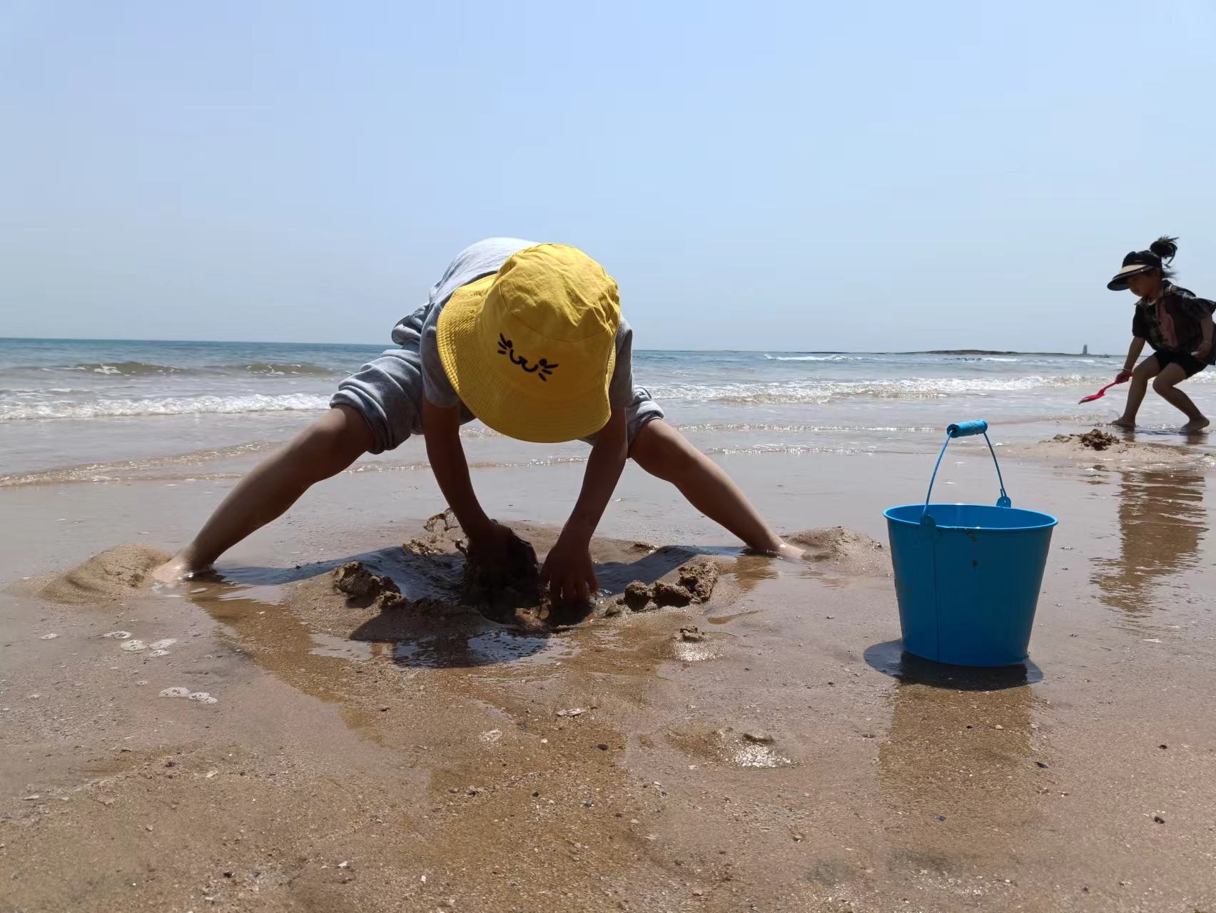 我们看到这样的大海和沙滩都非常兴奋,小孩子更是对海水和沙滩没有抵抗力,儿子非常兴奋,迫不及待的脱下鞋子挽起裤腿下去玩儿,挖沙子,捡贝壳,踩海水,我也脱去鞋子踩在沙滩上,细沙在脚底下流淌,海风吹在脸上,耳边传来海浪拍击沙滩的声音,这样的声音和感觉让我感到平静和放松