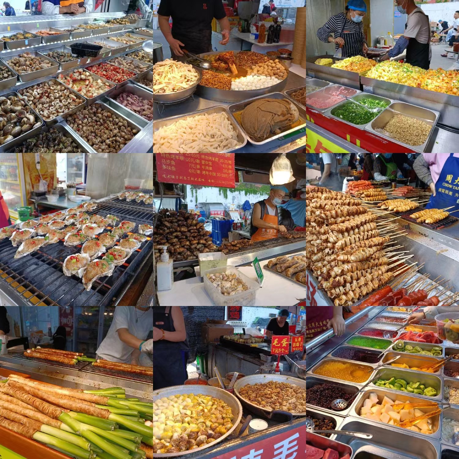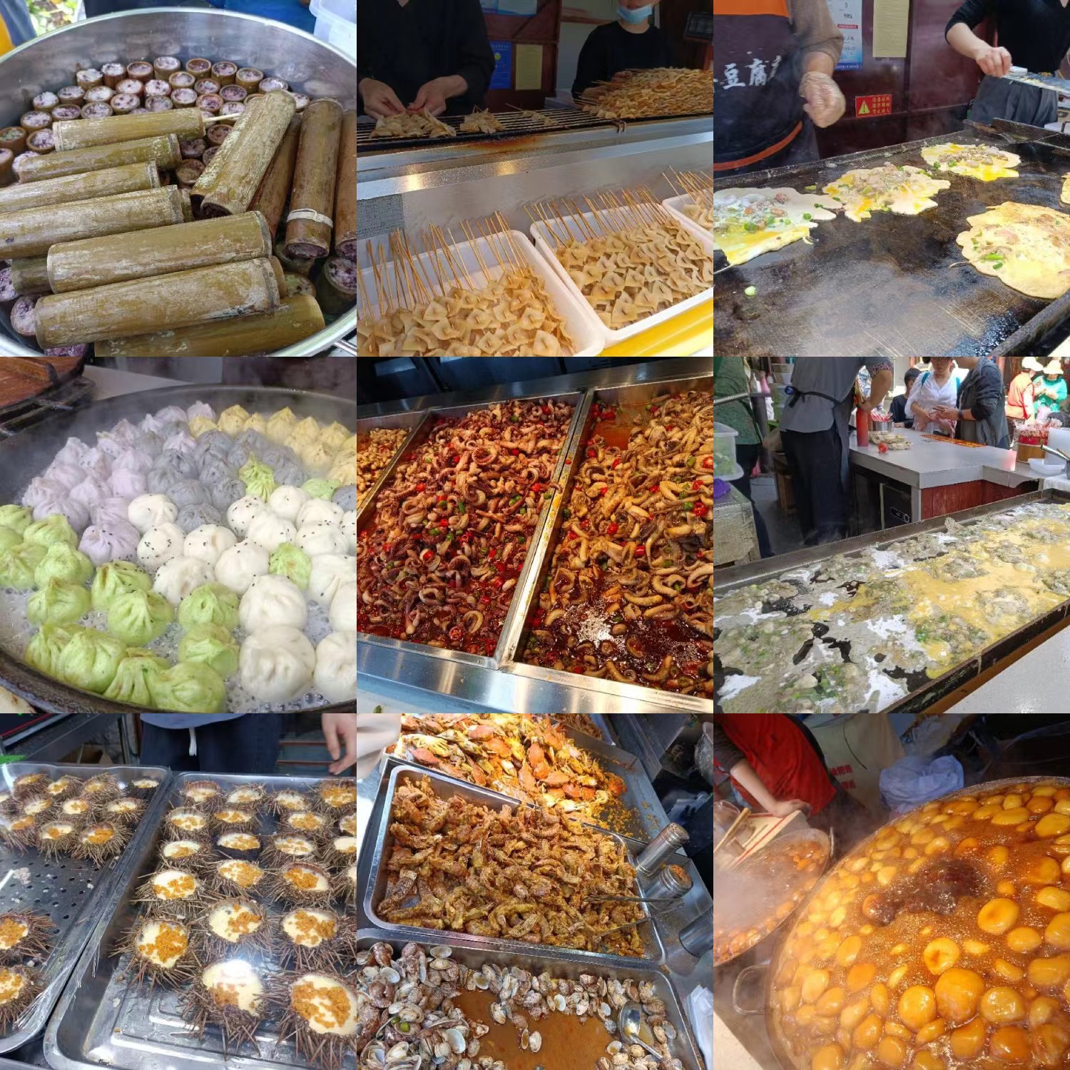 下午4点从万平口出来,骑上自行车去大学城夜市觅食,大约有6公里,大学城夜市位于滨洲路与烟台路交叉口,汇聚了天南地北的味道,是夜晚日照最热闹的地方。到了地方看到各种各样的小吃美食,激动坏了,各种各样喜欢的小吃都来一份,卤煮、牛杂、小龙虾、大肠包大葱、捞汁小海鲜等等等等,最好吃的当属炸串卷饼,地地道道的山东大饼卷上刚油锅里捞出来还滋滋冒油的食材,麻辣鲜香十分美味,应该没有人能抵御的了这种诱惑吧,吃到一个多小时,酣畅淋漓,吃到撑,很满足