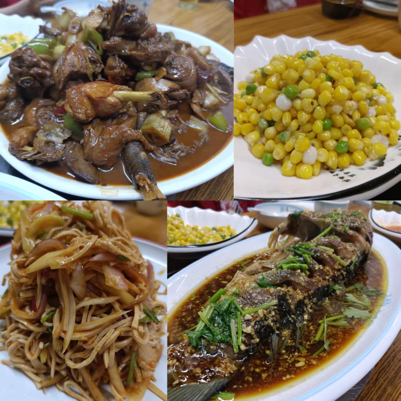 离开的路上又堵了半小时,堵车时顺便找了找晚上吃什么,看到一家沂蒙炒鸡点还不错,决定去吃,238的套餐,一份炒鸡,一条鱼,还有两个配菜,味道很不错,量也足,我们4大1小没吃完
