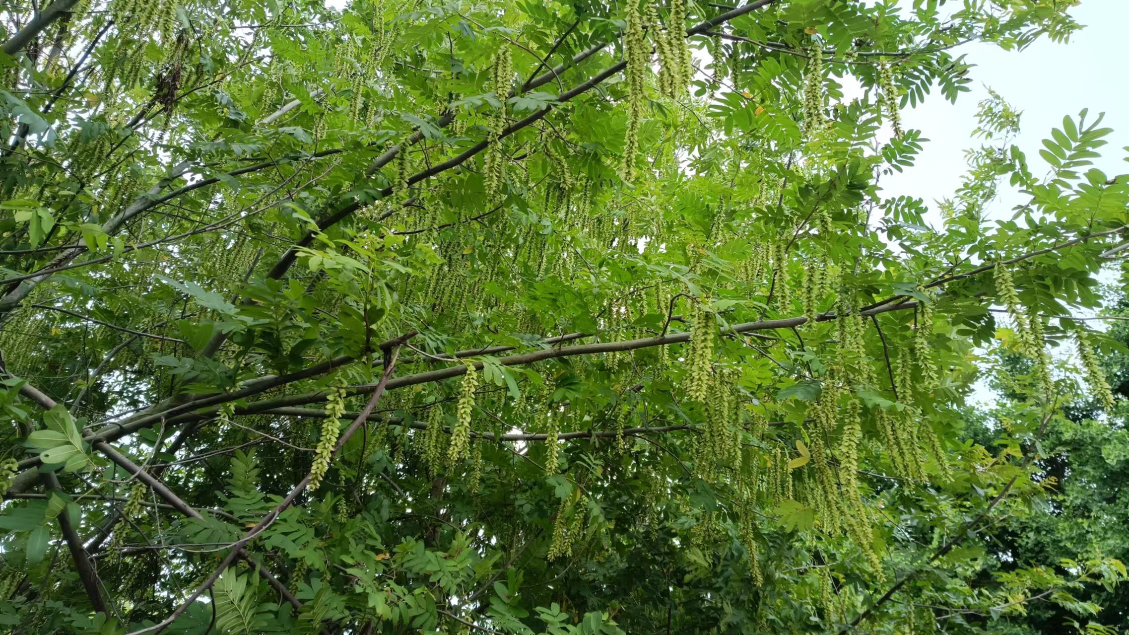 车子经过一段小路,路边长了一棵大树,大树上挂满了长串的果实,之前没有见过这种植物,以为是榆钱,小时候的课本里讲过榆钱树,过去条件不好的时候人们会拿它的果实来充饥,印象深刻,但从来没有见过,这种长长的果实就像是古代一串一串的铜钱一样,我以为这就是榆钱,但查了一下似乎不是榆钱,而是枫杨