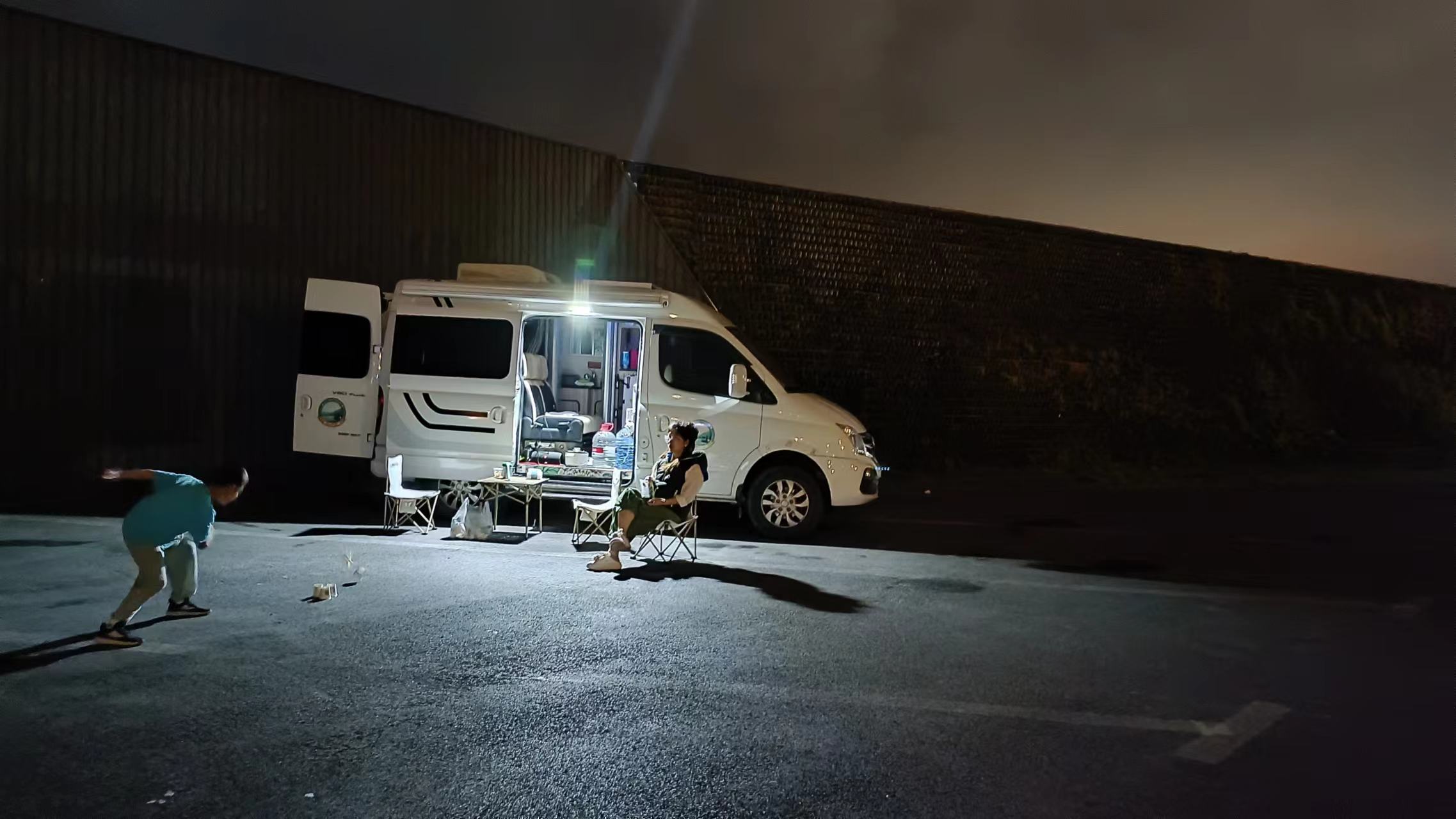 看了地图离芦潮港公园不远,城市公园一般环境都不错,还有停车场,白天的话可能没有位置,但到了晚上基本大家也都回家了,车位充足。到达公园停车场,除了离马路稍微有点近,其他的还真的不错,虽然有点晚了,但还是撑起桌椅,煮个晚饭,一家人坐下来慢慢享用。饭后,小朋友自己找到了玩儿乐的项目,像打保龄球一样,那一次性筷子扎起球,去丢垒起来的杯子,玩儿的也不亦乐乎,趁这个时间我来洗刷收拾