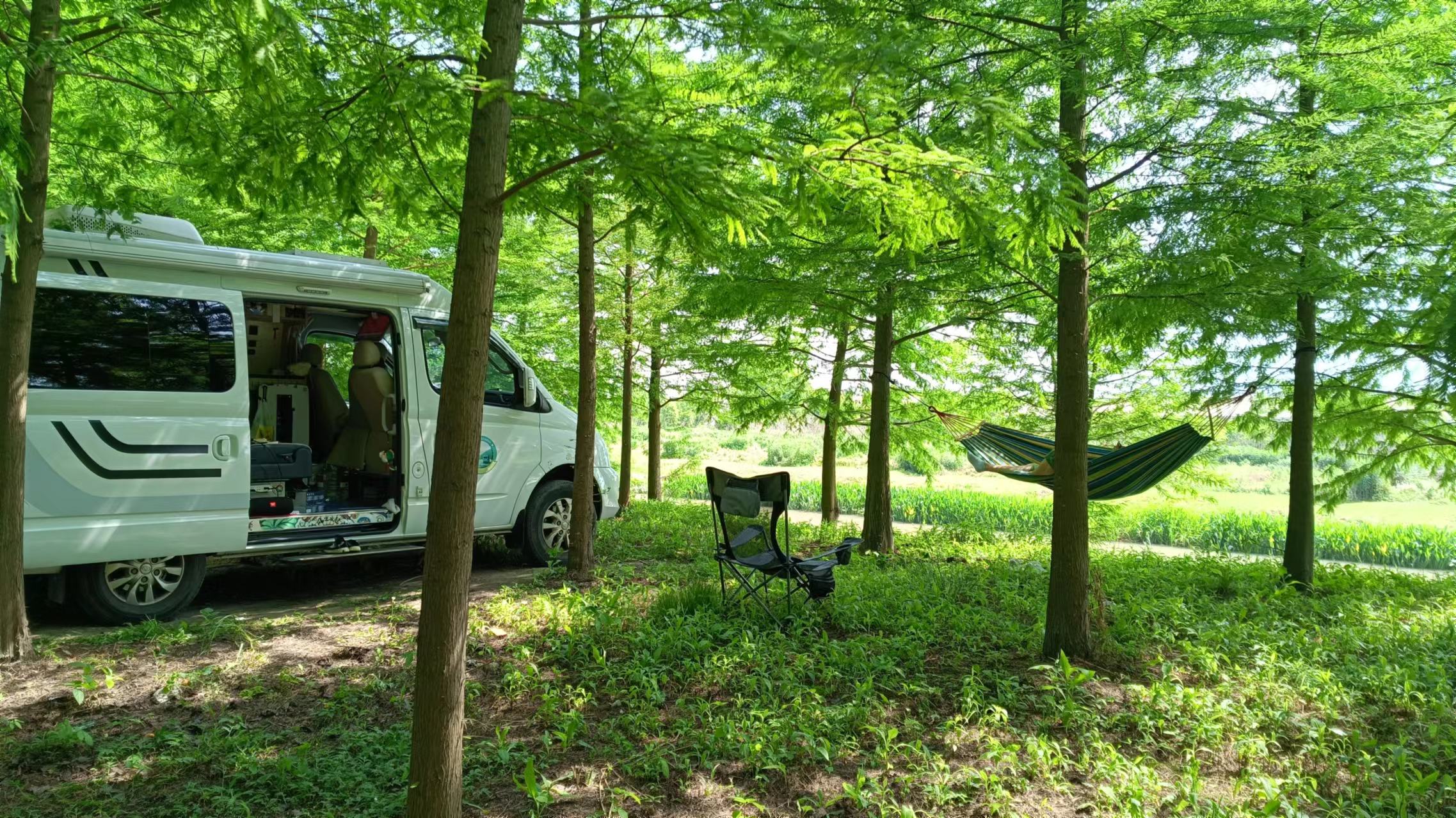 塘下公路大部分的路段都是双车道,刚好能过两辆车,路边不好停车,继续往前,寻得路边大片树林,且能开车进去,就停下休息,困意袭来,撑起躺椅,挂上吊床,午休