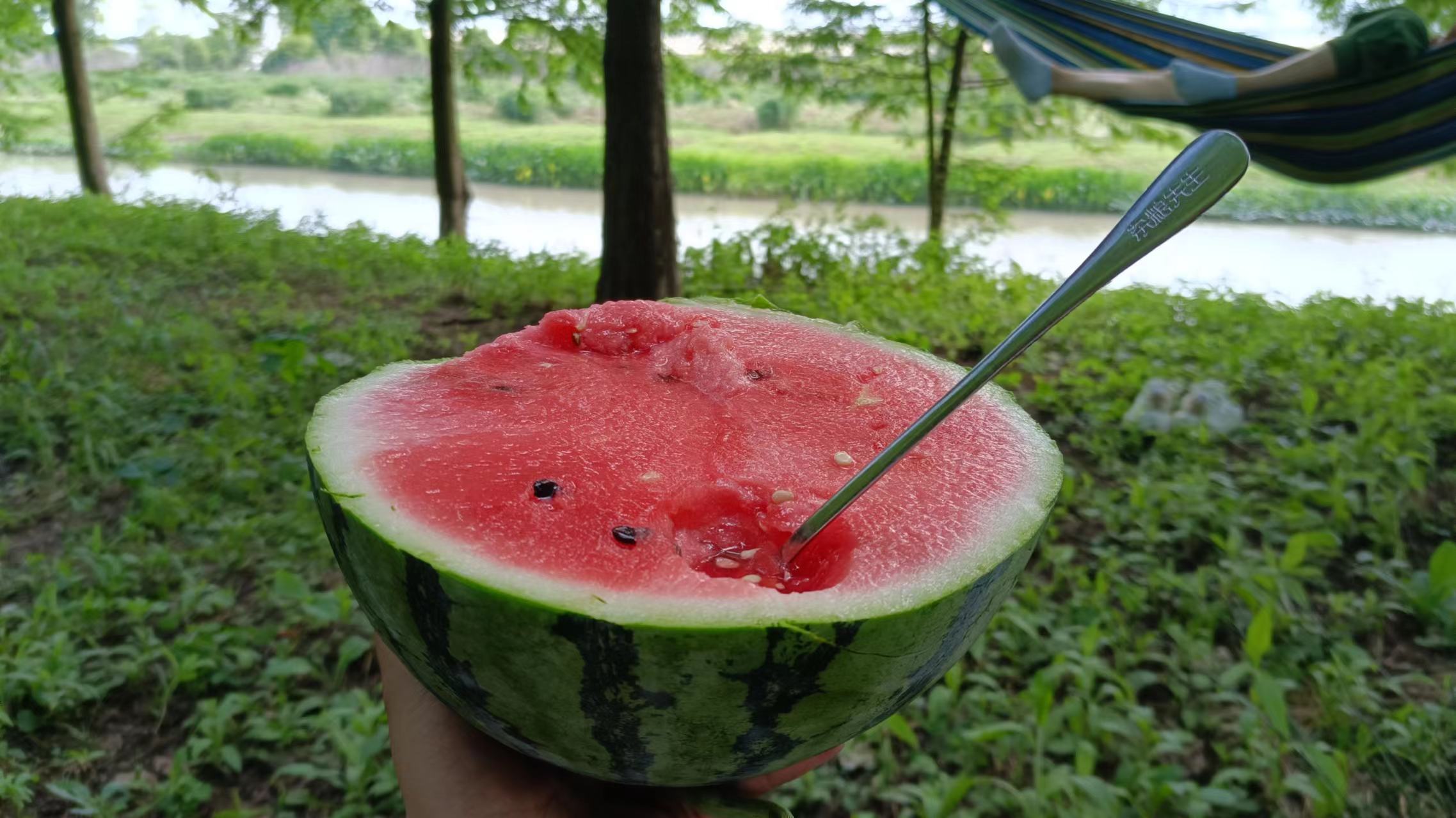 风吹过树林,吹在身上,凉凉的,很舒服,尽管旁边的路上时不时的有大车呼啸而过,竟也睡着了,很香。树林里,又是在河边,按理说应该有很多蚊子,可能是因为有风,实际也还好,不多。上午在路边看到有卖西瓜的,买了个放在冰箱里冻着,这会儿正好冰凉,切下一半,挖上一勺,真甜