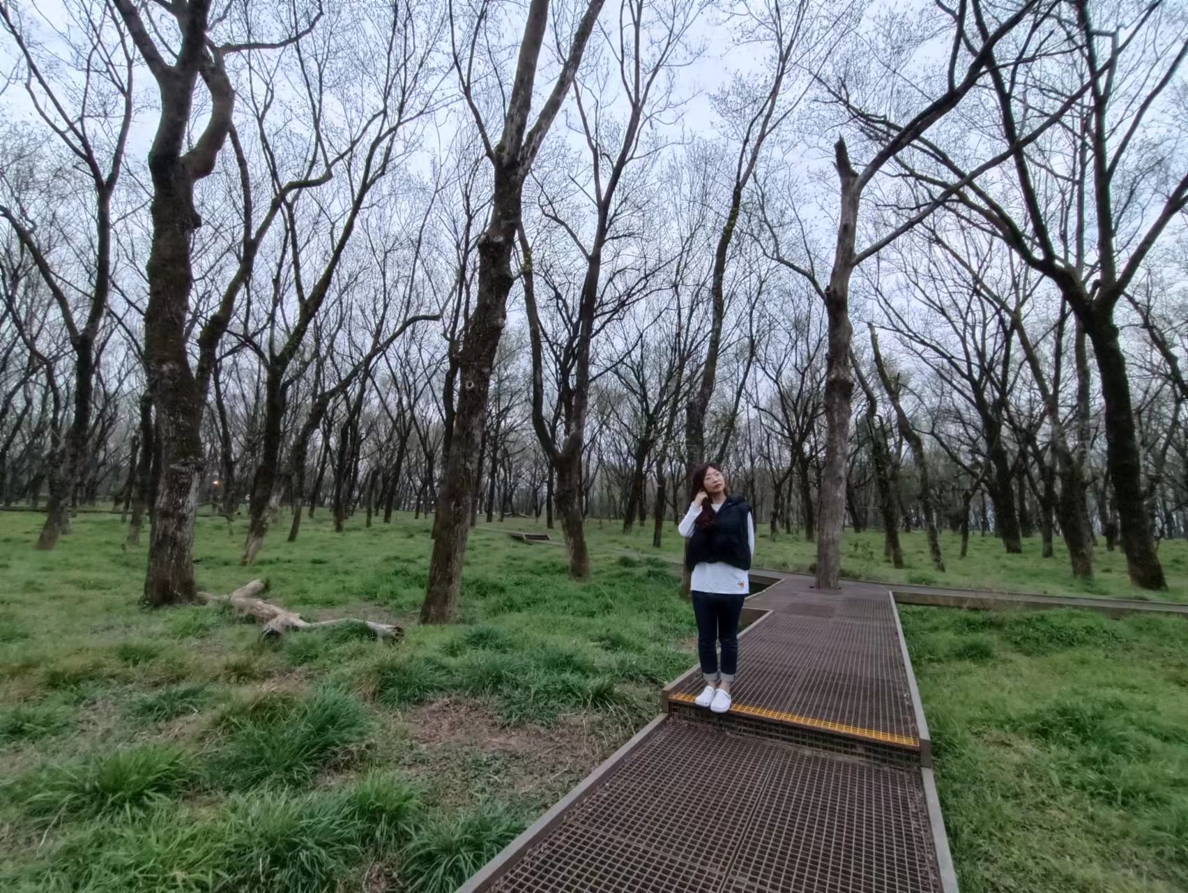 但桐州岛还没有走完,我们想先环岛一周,继续往前走到了岛的西侧,被一大片的枫杨林惊喜到,树木参天,鸟鸣清脆,绿草成茵,林中悠悠而去的栈道,曲折幽深、典雅别致。缓缓行之,一种安静、闲雅、放松、随心的感觉飒然而至。有诗云:树密不知林尽处,影疏浑隔水中央