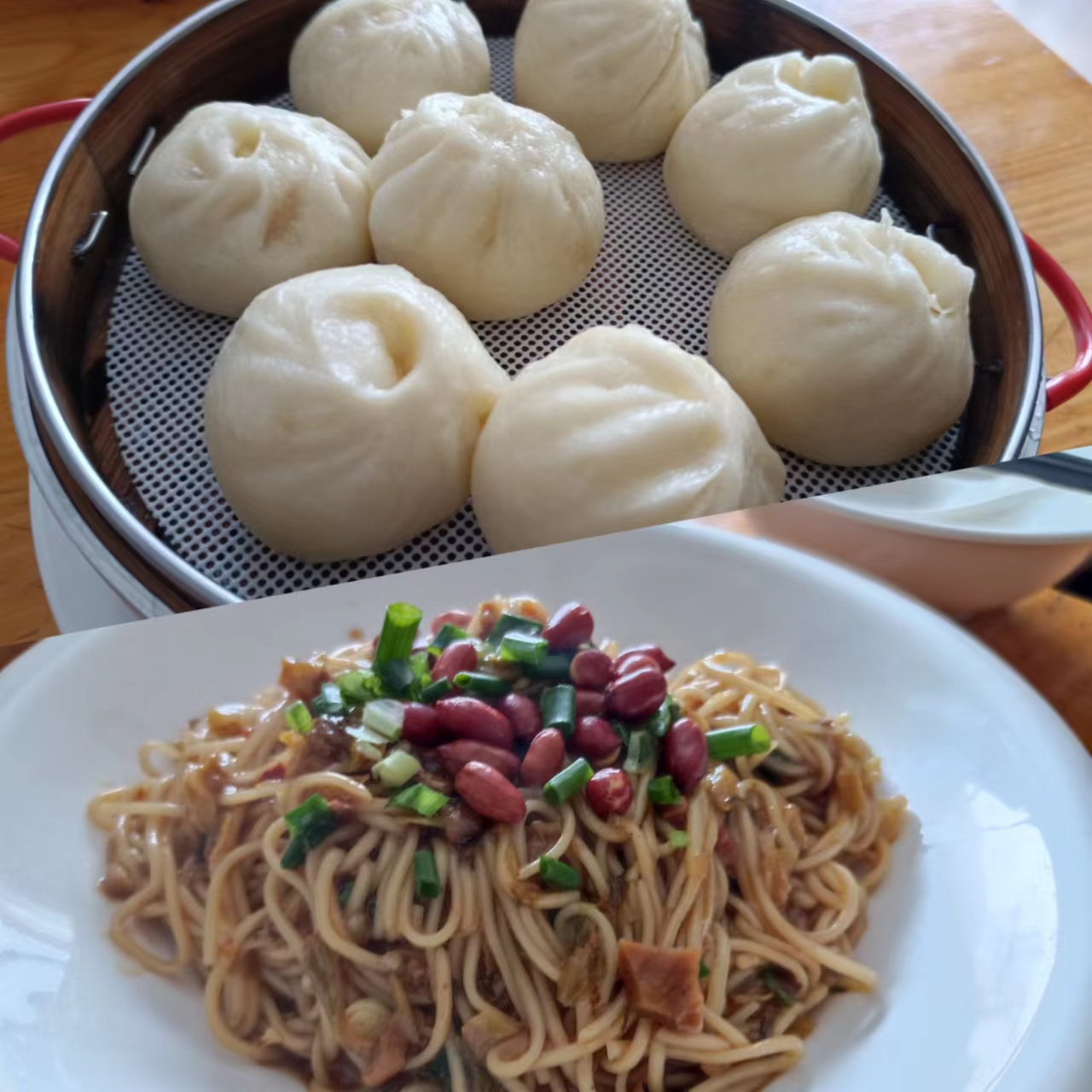 收拾完毕继续去镇上找炸串,依然没有找到,因为人家早上不出摊,于是在镇上的早餐店点了早餐,点了小笼包,特色拌面,还有小馄饨烧卖啥的,味道还不错,尤其是小笼包和特色拌面,这里的小笼包里不会流出汤汁,皮比较厚都把汤汁吸收了,拌面跟武汉热干面有点像,但又不一样,口感粘滑,我觉得还挺好吃