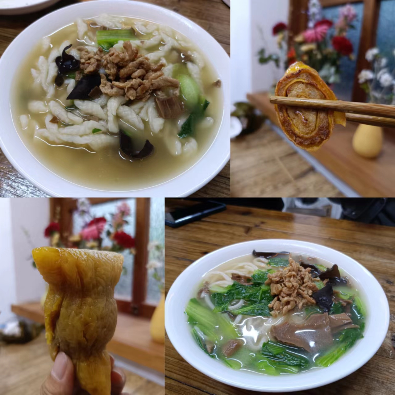 逛着逛着天黑了,连续逛了几个村子,都没有时间吃饭的,看今天行程就要结束,我们也在村子里一家面店吃饭,点了一根面、米筛爬和响铃,应该都是本地特色美食,味道也都不错,米筛爬也是面食,有点像陕西的烩麻食,汤底更为鲜美,有竹笋木耳青菜肉丝做配料,吃上一碗很满足