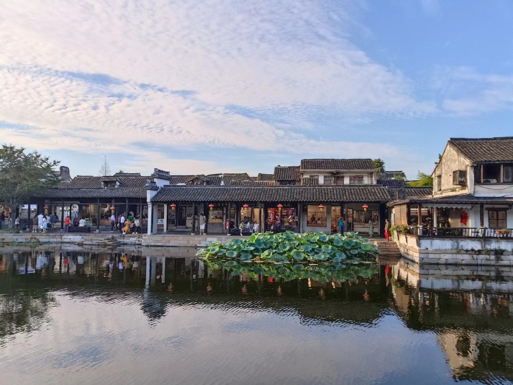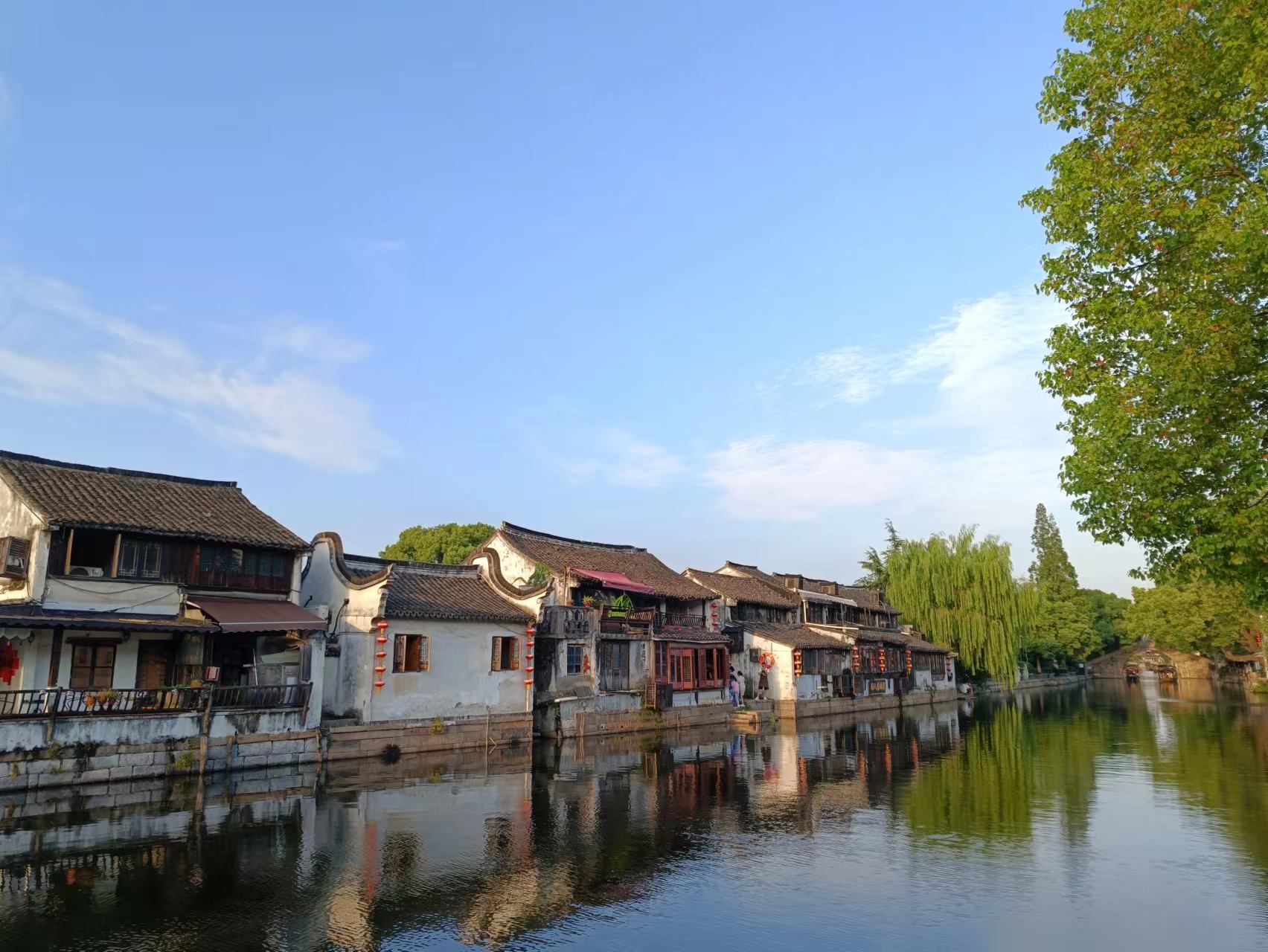 下午5点,太阳还未落山,蓝天白云下,绿树瓦房倒映在河水中,十分好看。西塘景区正常的门票要100元/人,我们免费进来立省几百块,风景一样,感受相同,免费的就是香