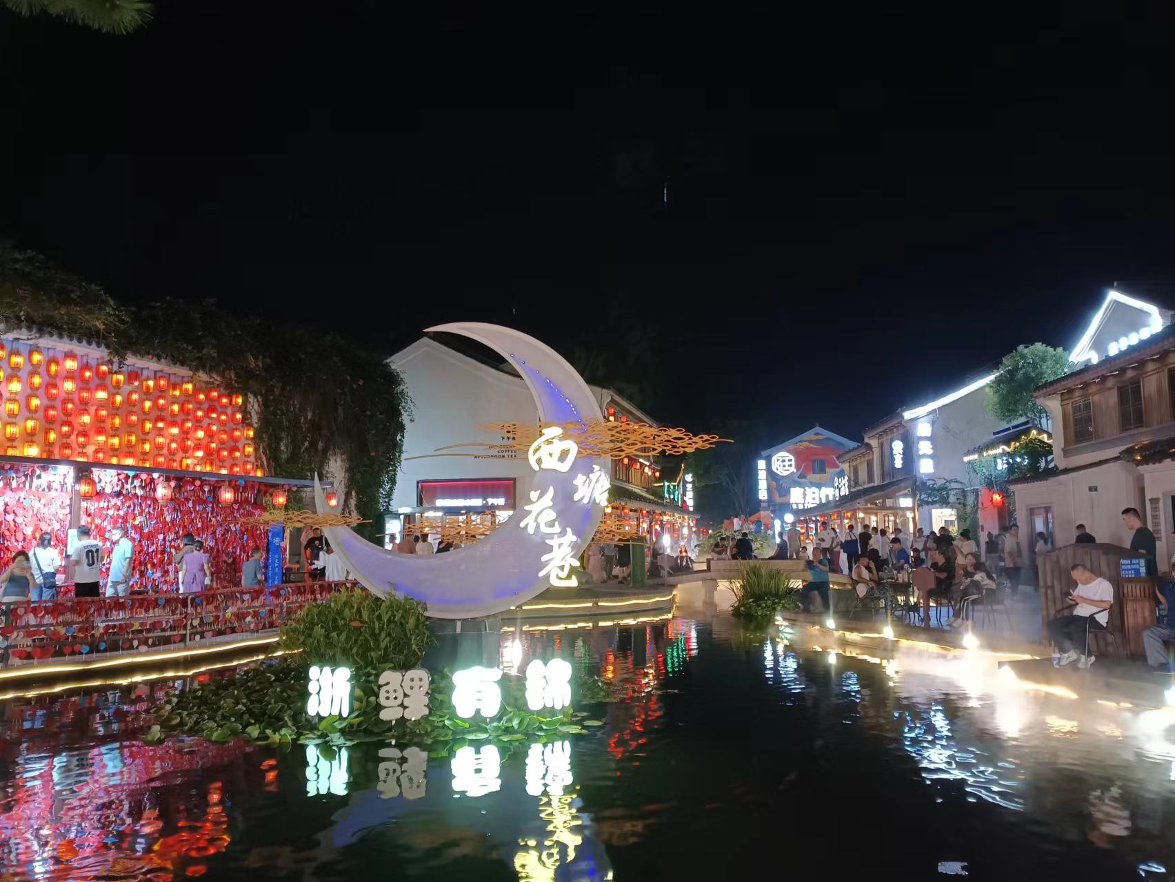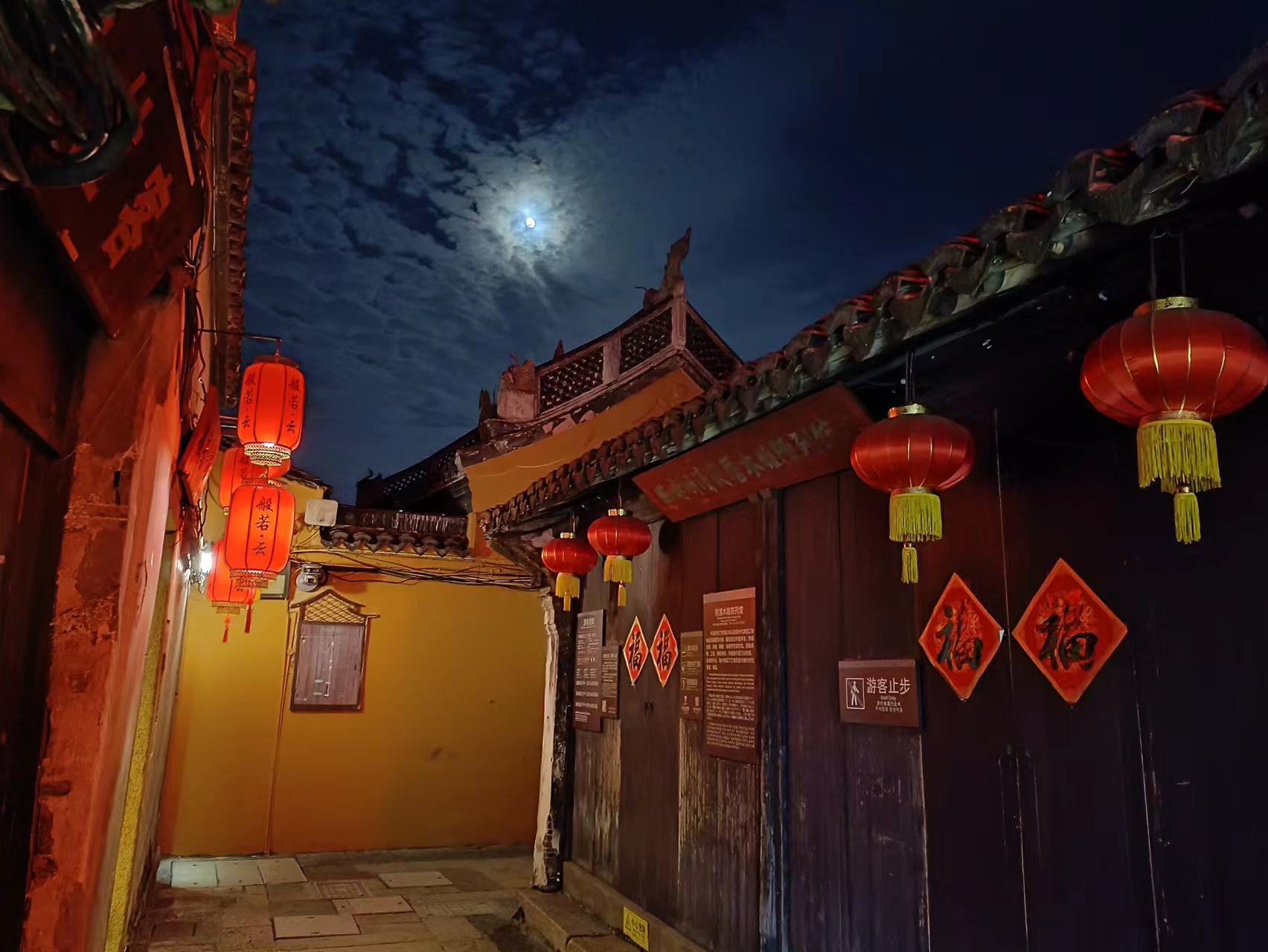 夜越深,灯越亮,游人越多,街道上人流熙熙攘攘,站在河边看对岸房屋在灯光和月光的映衬下也更加迷人