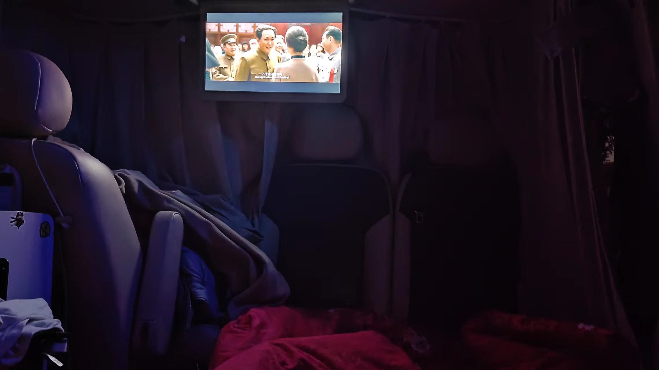 做完这一切也才8点多,睡觉还太早,那就看个电影吧,关上车门,打开电视,放个电影,车外安安静静漆黑一片,车内则与家里无异,娘俩坐在床上盖上被子,暖暖和和,小家伙看了不一会儿就睡着了
