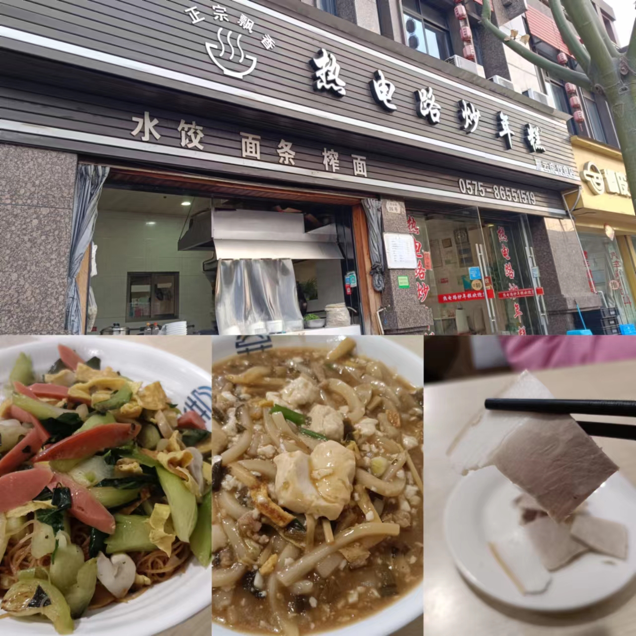 选择了不那么远的绍兴,时间比较充足,没有赶夜路,好好的睡了一觉,精力也是非常好。中午12点左右出发,下午4点到达新昌,下高速的那一刻就发现这里热热闹闹,烟火气很足,跟去过的很多城市都不同。听闻新昌碳水王国,好吃的特别多,中午都没吃饭,留着肚子吃美食。下了高速直奔第一站热电路炒年糕,在兔毛市场边上,点了一碗酸菜豆腐炒年糕,一份炒榨面,外加一份糟肉