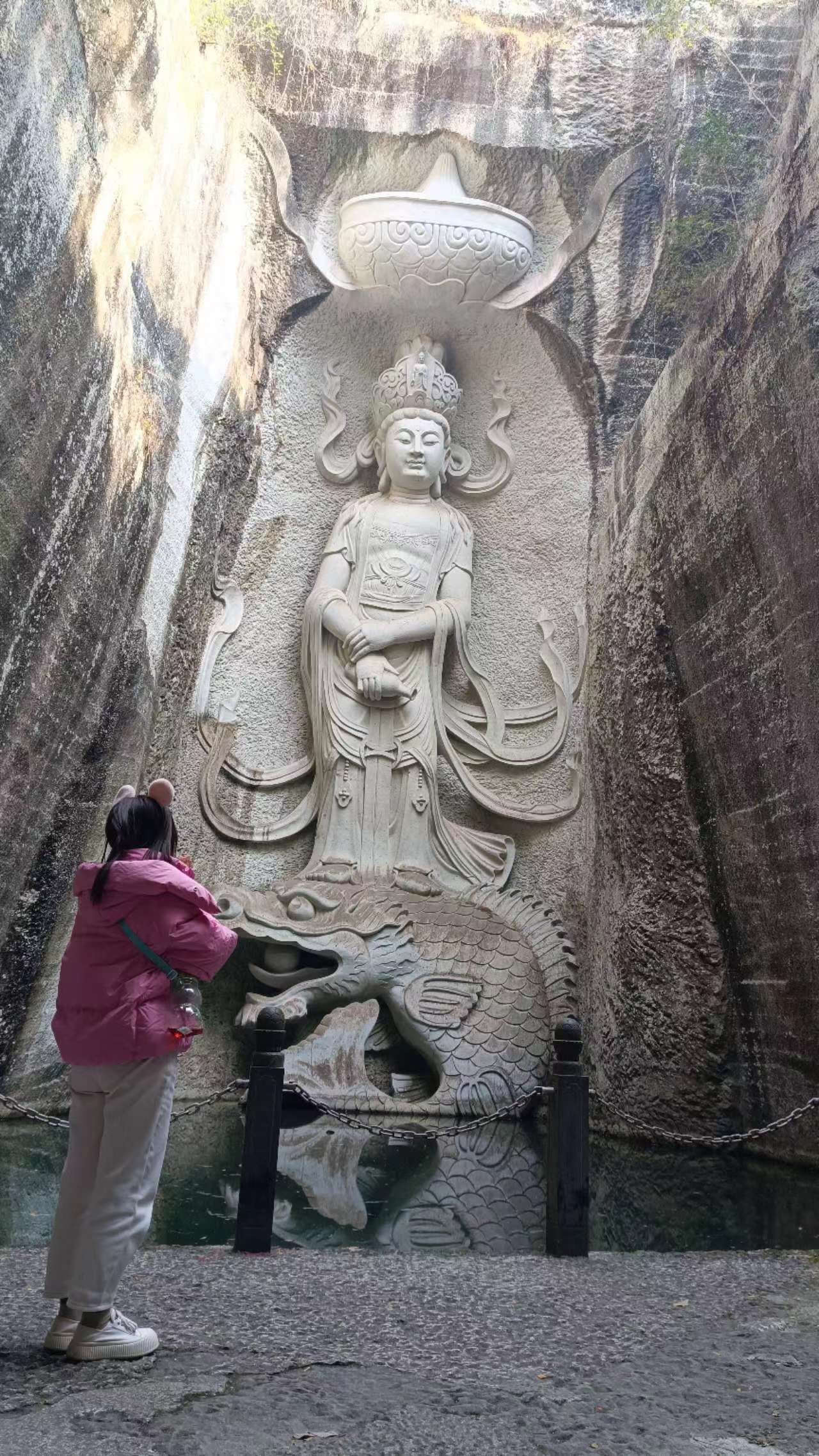 从般若谷出来会路过栖光净院,栖光净院很大,我们去的时候正在修缮中,背后有一座万佛宝塔,逛了一圈出来又回到了佛心广场,佛心广场往出口方向的山上走会经过城隍庙、千佛禅院、双林石窟。其中千佛禅院是除大佛之外的另一处石窑造像,据说建造年代比大佛还要早,而双林石窟则是现代建造的,过了千佛禅院通过空中栈道可以到达,石窟内造有亚洲第一卧佛。过了双林石窟就快到了出口,转了一大圈已经累的不行,却发现我们并没有看到大佛寺,江南第一大佛石弥勒没有看到,于是仔细看了下地图,发现就在放生池的对面,于是再拐回头去大佛寺,此时已经接近下午四点半,好在赶在关门前看完了大佛寺,不仅看到了江南第一大佛,还在大佛寺内的摩崖石刻上看到了米芾所书的「面壁」题刻