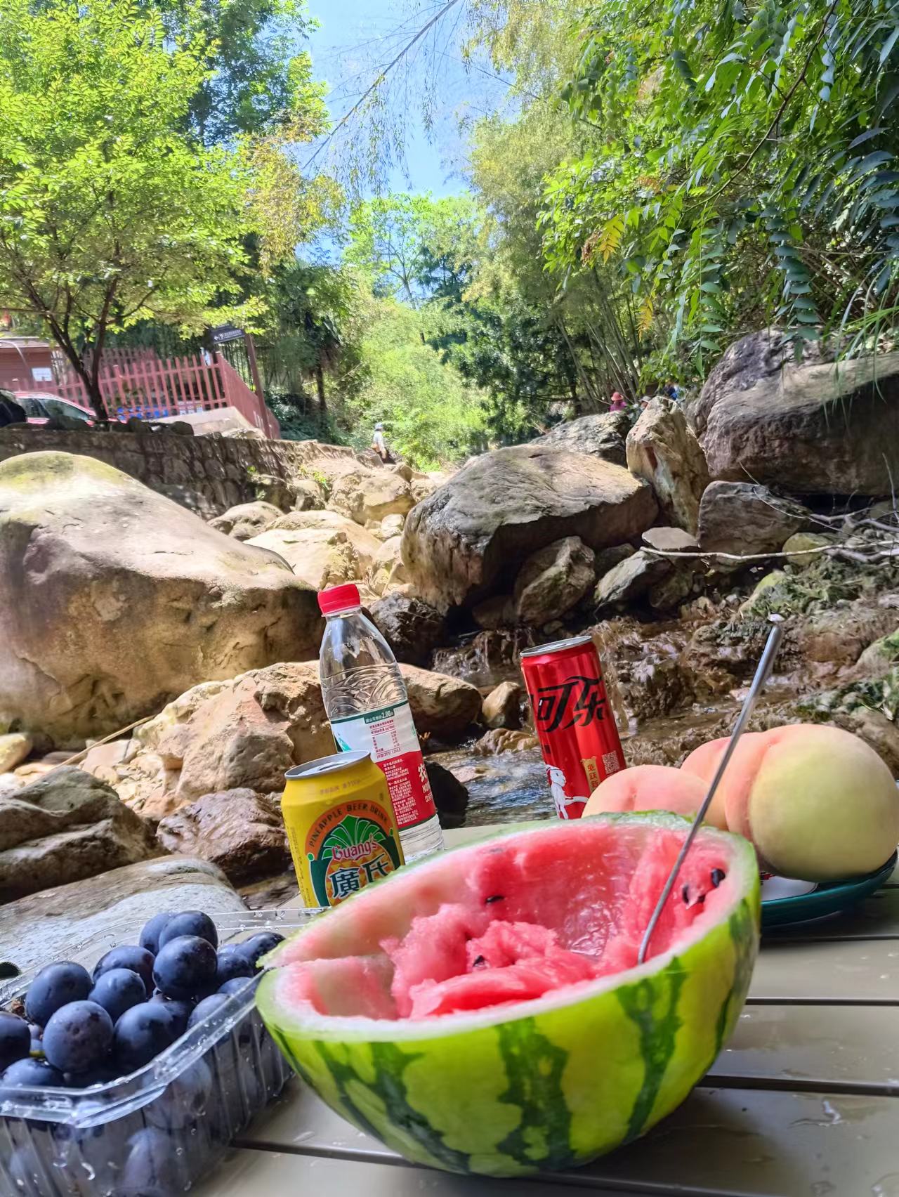 停车场边上就是小溪,收拾东西,带上桌子椅子先找个凉快的地方去玩儿水,溯溪而上,不远的地方就找到了个不错的位置,树荫下晒不到太阳,撑起桌椅,切开刚从冰箱里拿出来的西瓜,吃上一口,还是冰冰凉,这感觉是真的爽