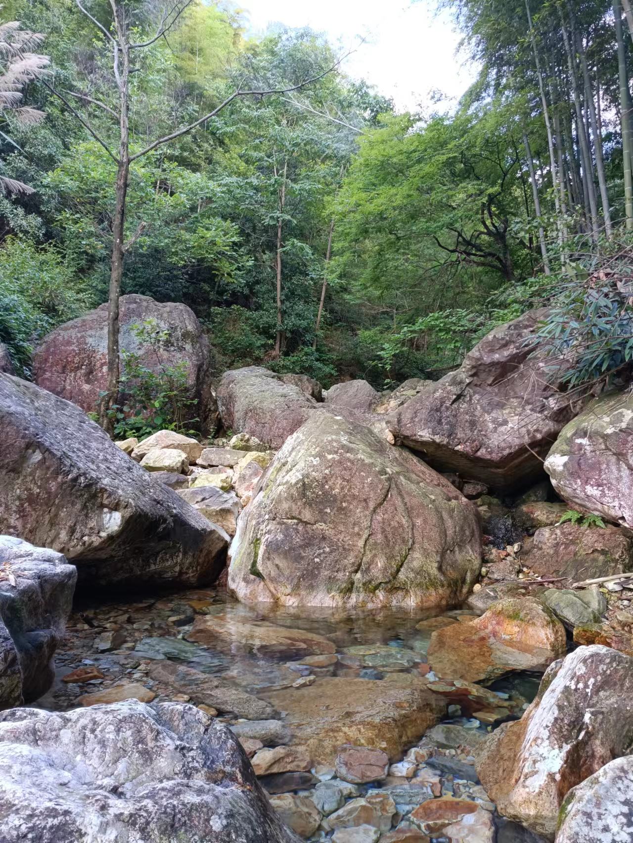饿了,把卡式炉和锅拿过来煮个米粉,解决了午饭,夏日的午后容易犯困,哗啦啦的流水这个时候就成了最悦耳的白噪音,老婆要睡觉,就把椅子挪个方向靠着岩石,半躺下一只脚泡在水里一只脚搭在对面的石头上,睡着了。而我则继续溯溪而上,去看看雪花潭,雪花潭位于海拔四百多米的位置,景区入口处海拔200米,仅有200米的海拔爬升,但最快也要走上三刻钟,溪水很清澈,若是要边走边玩儿的话,那几个小时可能都不够用