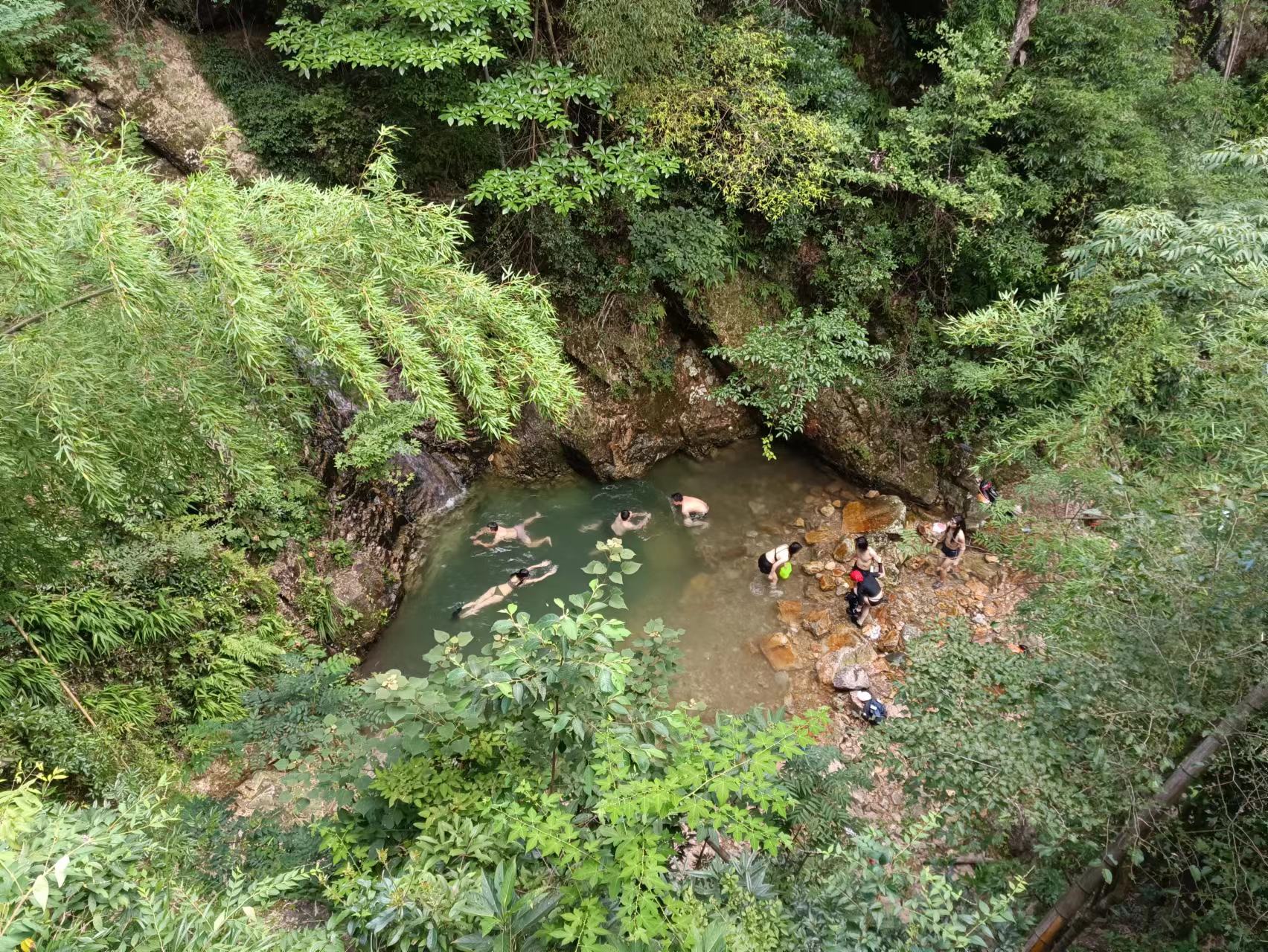快到山顶的位置,有一处叫涤心潭,应该算是这一路众多水潭中较深的一个,有一群充满活力的年轻男女在游泳跳水,伴着激情的音乐,从高处跳下,激起大片水花,玩儿的非常嗨,热情似火的年纪肆意挥洒,感染着路过的每个人