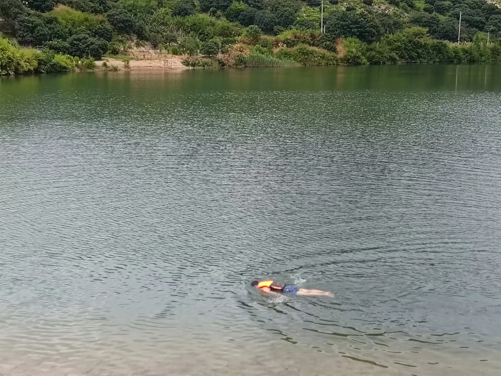 而我则迫不及待的换上泳衣,下水游泳,水很清,水里肉眼可见的很多小鱼。不熟悉水里的情况,就只敢在穿着救生衣的情况下,靠近岸边不远的地方游泳,越往中间水越深,大概探了下水深1.6米的位置,就在这个安全范围内游了