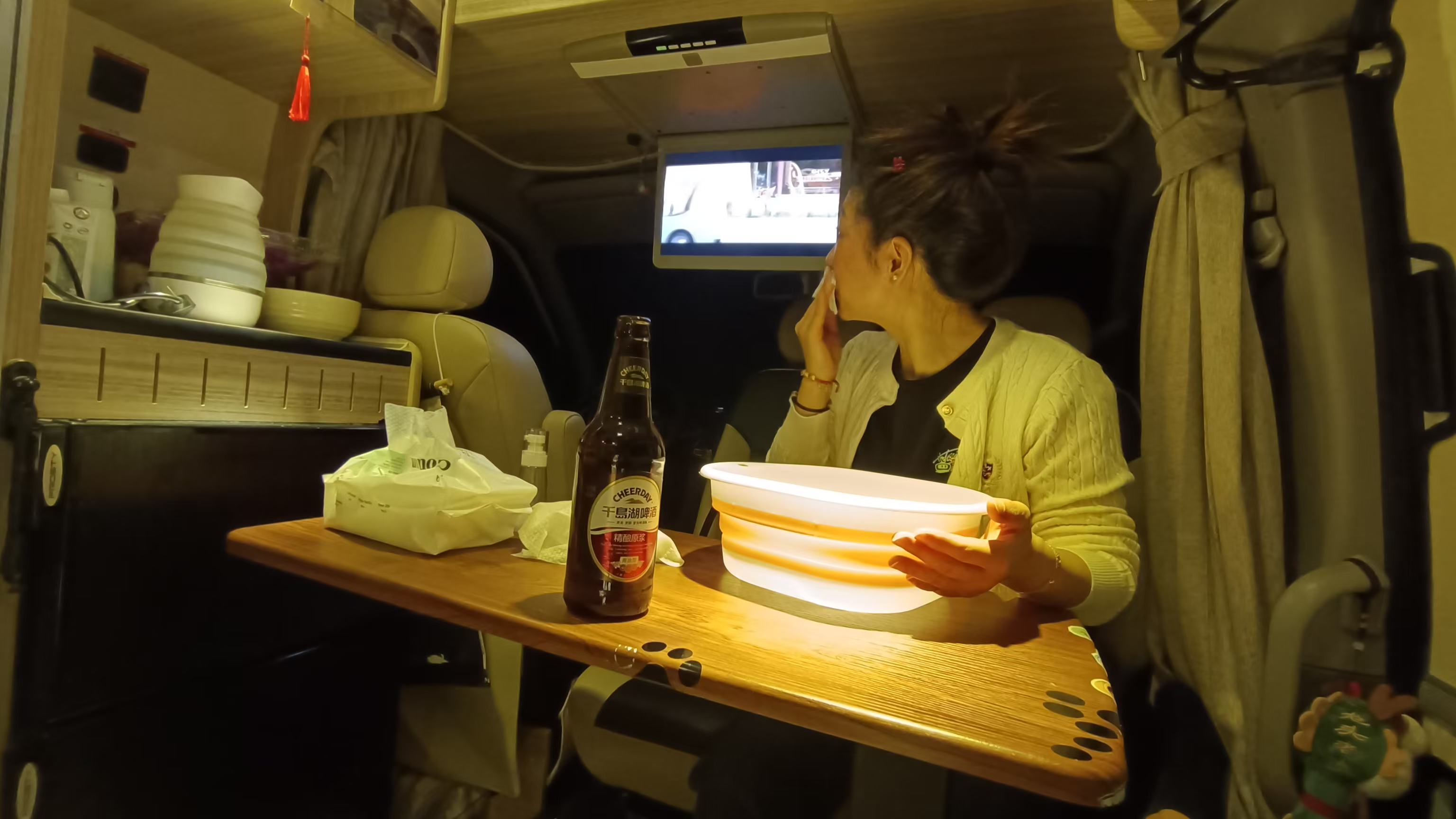 饮用水的用量不会很多,根据经验来看一般一天也就3升左右。我通常是买5L或者12L的桶装水,5升的桶装水大概10块钱,用两天左右,也不算很贵,容量大的还会更便宜。我之所以常买这两个容量的桶装水主要跟车子上的空间有关,主驾驶座位后方正好可以放两桶5升的桶装水,中间淋浴间的角落里也正好可以放一桶12升左右的桶装水,位置大小刚刚好,保证车子行驶的过程中不乱动