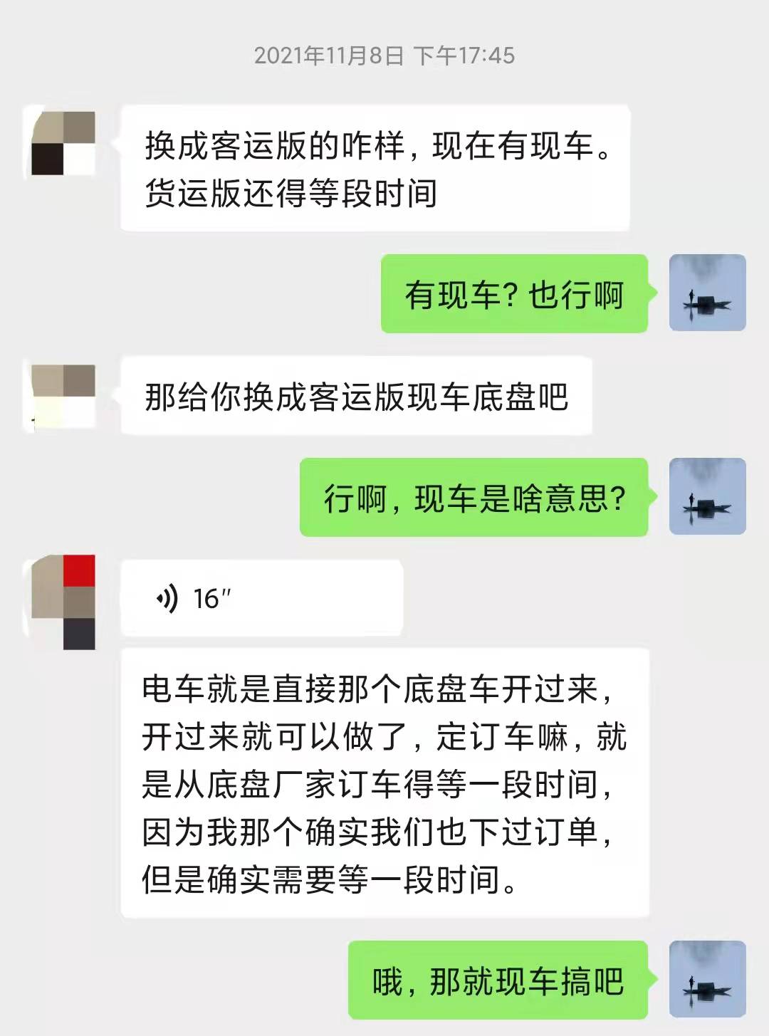我付了定金之后,改装厂那边去底盘厂定底盘,十一月上旬我除了跟销售沟通一些房车的细节之外,剩下的就是经常问销售小哥底盘有没有到位,问了几次都是说厂家已经接收订单但没那么快。11月8号销售小哥问我要不要换成客运版的底盘,客运版有现车,我之前定的货运版还要等一段时间,客运版和货运版的区别主要是货运版车身都是铁皮而客运版的车身有一圈的玻璃,我之所以想定货运版的是想着货运版在隔热保温上可能更好一点,销售小哥说两者在隔热保温上没太大的区别,既然没区别那客运版还有现车,有现车就意味着能早点提车,何乐不为,于是便欣然答应了,谁能想到就这一点变动这为后边的上盘带来了诸多的问题,具体的后边再说
