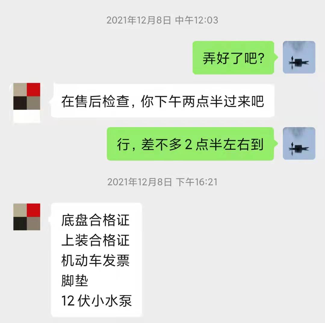 12月初带上娃一起回了老家,原本以为3号左右就能提车的,结果因为座椅缺货等问题最终8号才提到车,提车当天付了全部尾款12万,在交车之后销售小哥告诉我有些东西现在没有稍后寄给我,就发了那个缺少的物品清单,包括上牌所需的底盘合格证、上装合格证、机动车发票,以及缺少的脚垫跟12伏小水泵