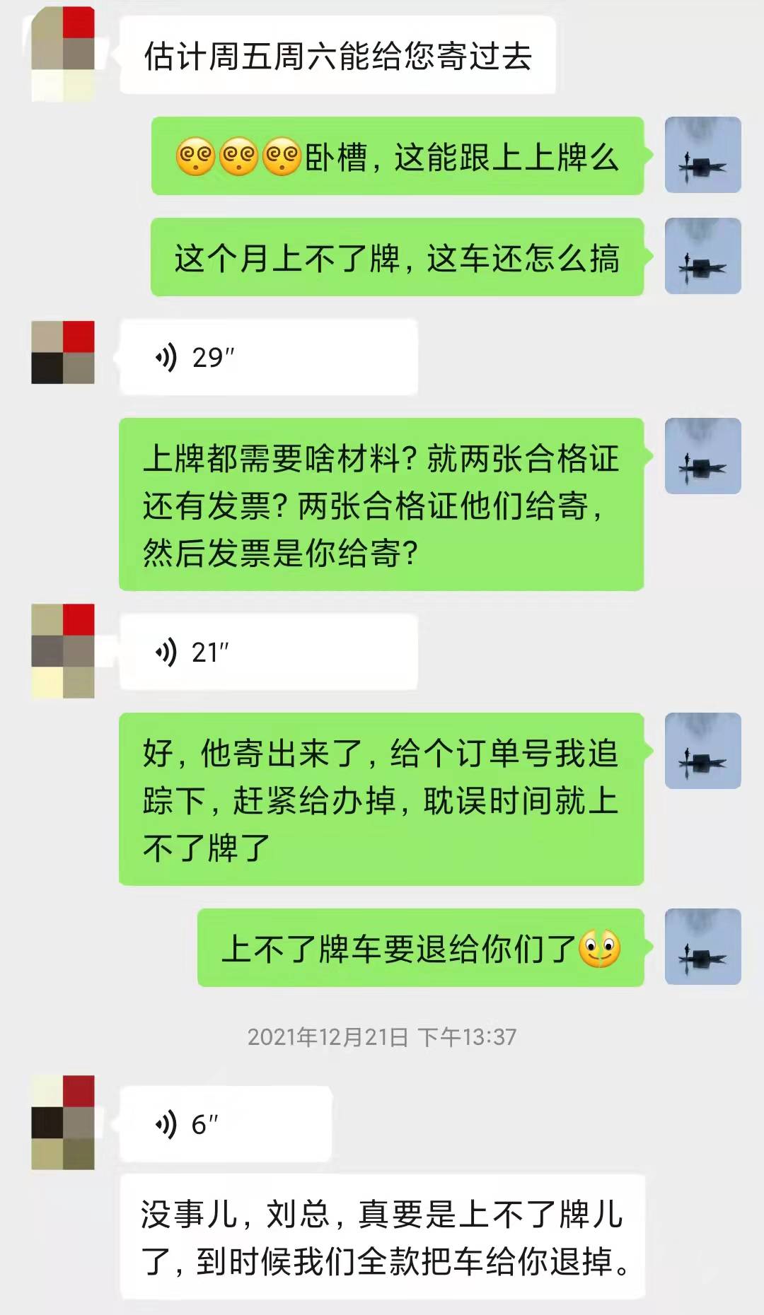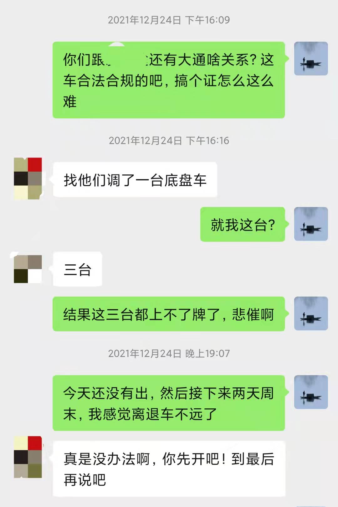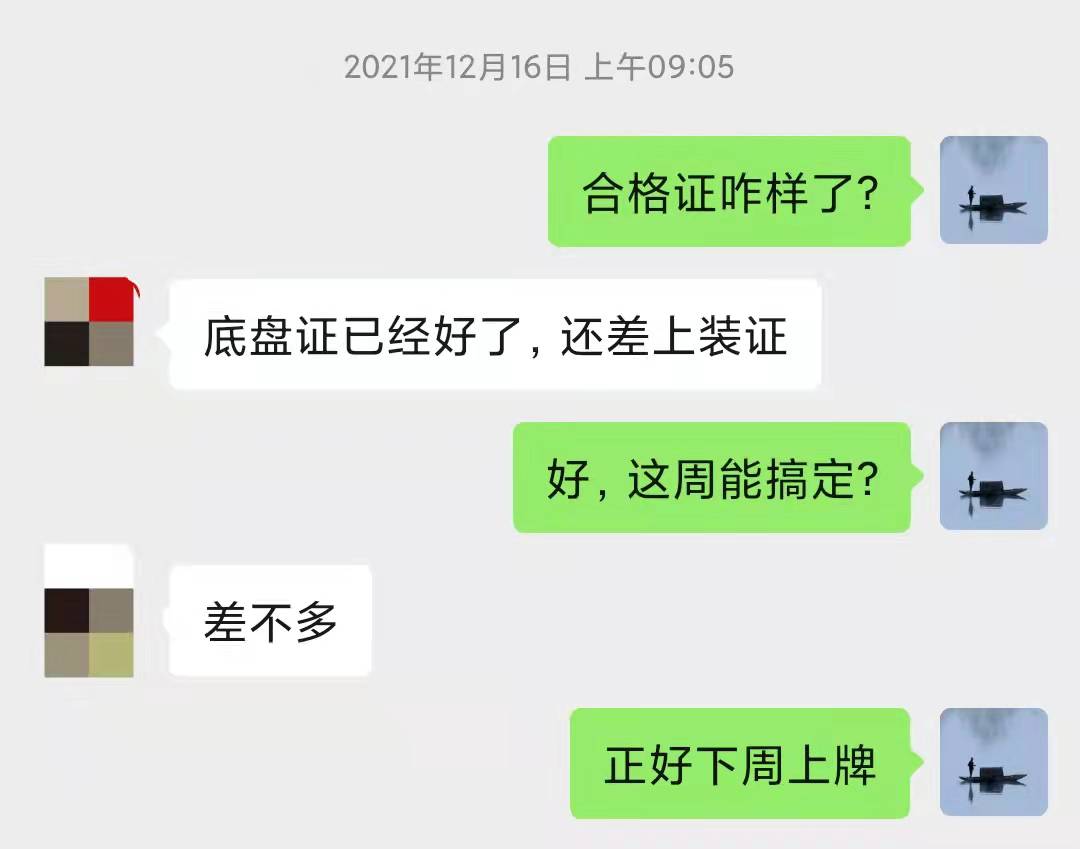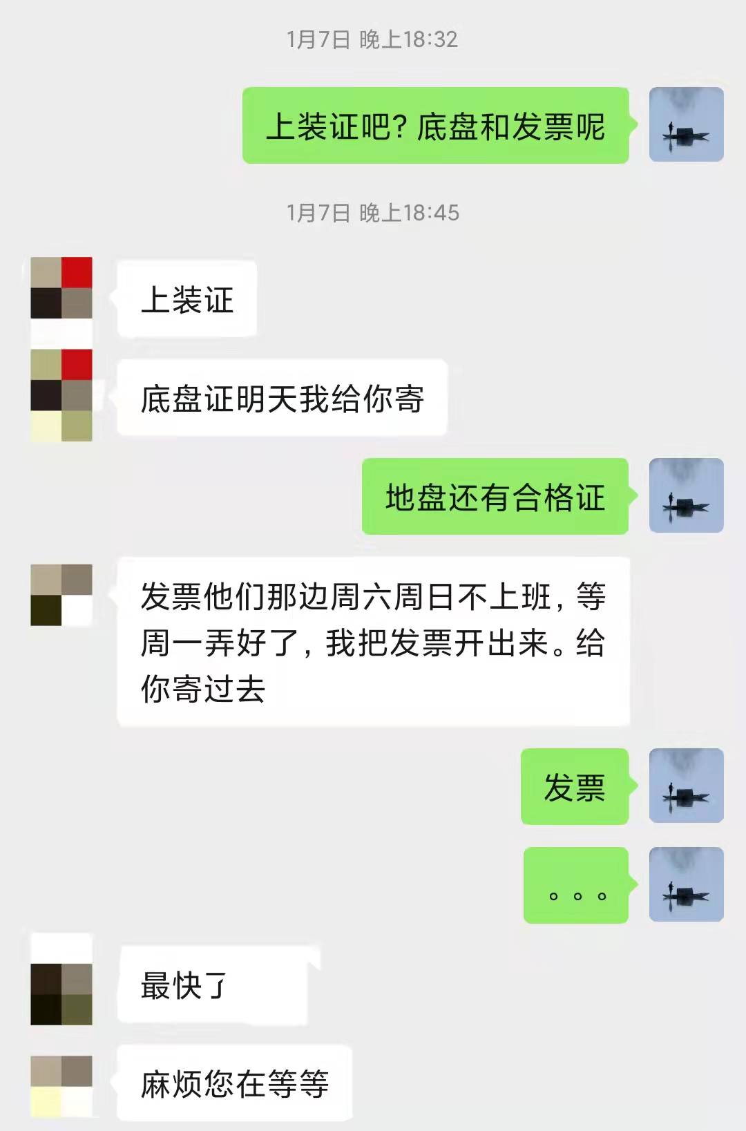 我能做的也有限,只能等了,天天为了这事真的心累,熬过了元旦,终于到了1月4号,跟他们确定发票是出了,但是有了发票还要出上装合格证,底盘合格证,上牌用的发票,中间具体啥流程我不清楚,但是资料还是没有寄给我,1月6号晚上,我实在忍无可忍下了最后通牒,1月7号晚上资料终于寄出,但仅仅是上装合格证
