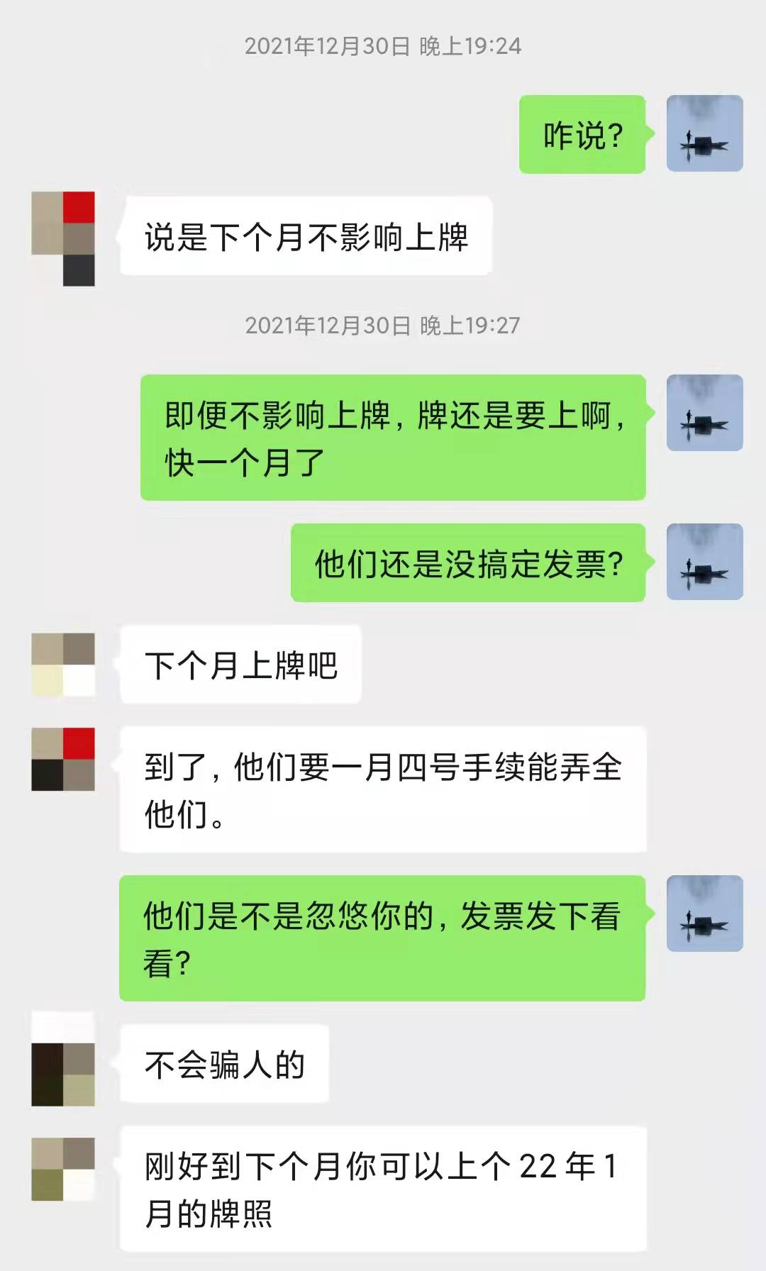 对于合格证跟发票这个我当时有疑问,销售小哥说整个房车行业都这样,我也便没有多想,说是一周之后寄给我,房车我计划开回上海上沪牌,而当前我还没有拍到牌照,所以上牌并不是很着急,上海牌照每个月拍一次,12月份的拍牌时间是12月18号,计划如果18号拍到了牌照就直接上大牌,如果没拍到就上沪C,所以对上牌资料并没有那么急切的需求,虽然中间也盯了几次材料的事情,都回复正在处理快好了,便没再多问,也没有想到过会在这上边出问题,但正是因为这三样资料让我后续上牌过程异常崩溃