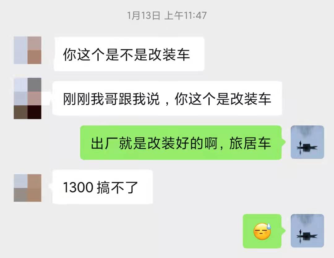 同时又联系了下房车的销售,了解下上牌的真实情况,是不是如黄牛说的一样,因为之前销售说过这房车完全符合公告,上牌无需担心,我信了,结果销售小哥说房车符合公告,但毕竟是改装车,如果真的要找毛病那也没办法,我了解了,看来靠我自己去上牌确实有难度,之前的黄牛又谈崩了,焦头烂额,重新找黄牛,通过某鱼平台找到了另一个黄牛,聊了详细的情况之后收费2000+1300块,2000块是检测+上牌的费用,1300块是做样车的费用,如果不做样车就2000块,做样车加1300,至于做不做样车要车管所那边决定,做样车的意思就是当地交管部门还没有收录过这个型号这个布局的房车,需要先打样备案,至于我的车型他们查过了要做样车的,看起来很复杂,我也没有太多的时间搞这事,想了下3300块也能接受吧