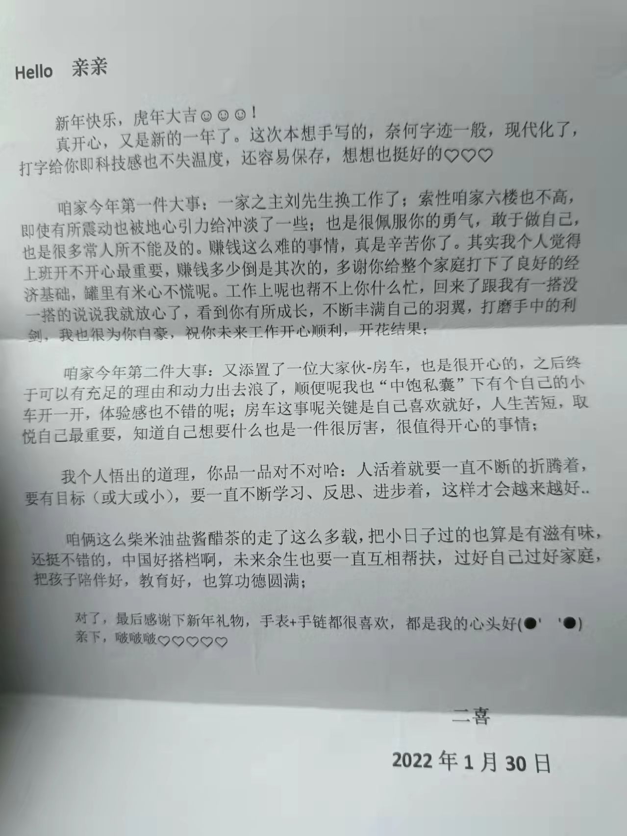 新年伊始,老婆送了我一份礼物,一张手写的贺卡,一段深情的文字,满满的感动,虽然已经发了朋友圈分享幸福,但我依然还想写下文章来纪念,在我看来,朋友圈是短暂的,而文章是长情的,我希望留住这份美好,能更久一点