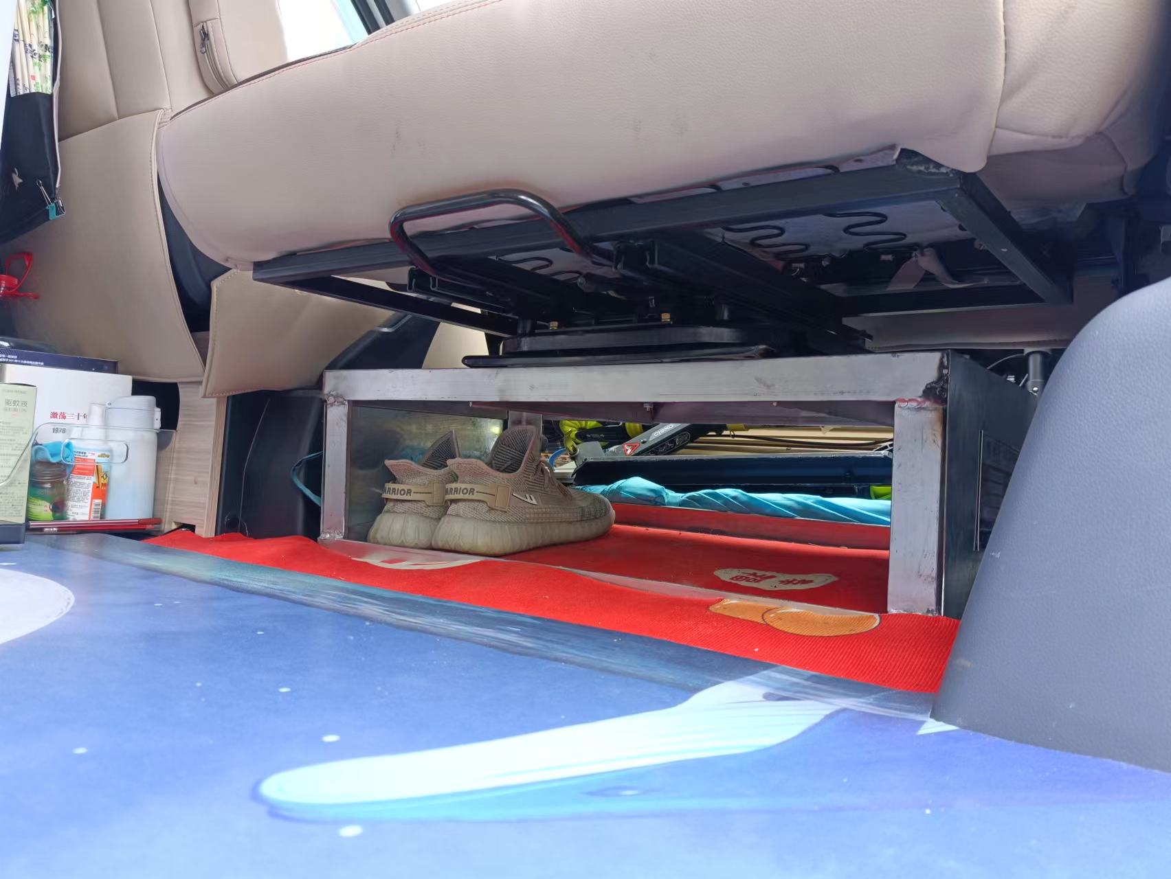 观察了下车子结构,副驾驶座椅下方是空的,之前有一个很小的底座三面封死,只能正面存放杂物,也很不方便拿取,于是就找了个师傅给焊了个座椅底座替换了原来的底座,新的底座量着尺寸去做,比之前大了不少,正反两面开口,无论哪里拿取都很方便,能轻松放下三双鞋子,这样要从中门上车直接脱了鞋子就能放进鞋柜了,很方便。房车空间有限,我也喜欢整整齐齐,所有的物品都有他的位置,整洁且好用