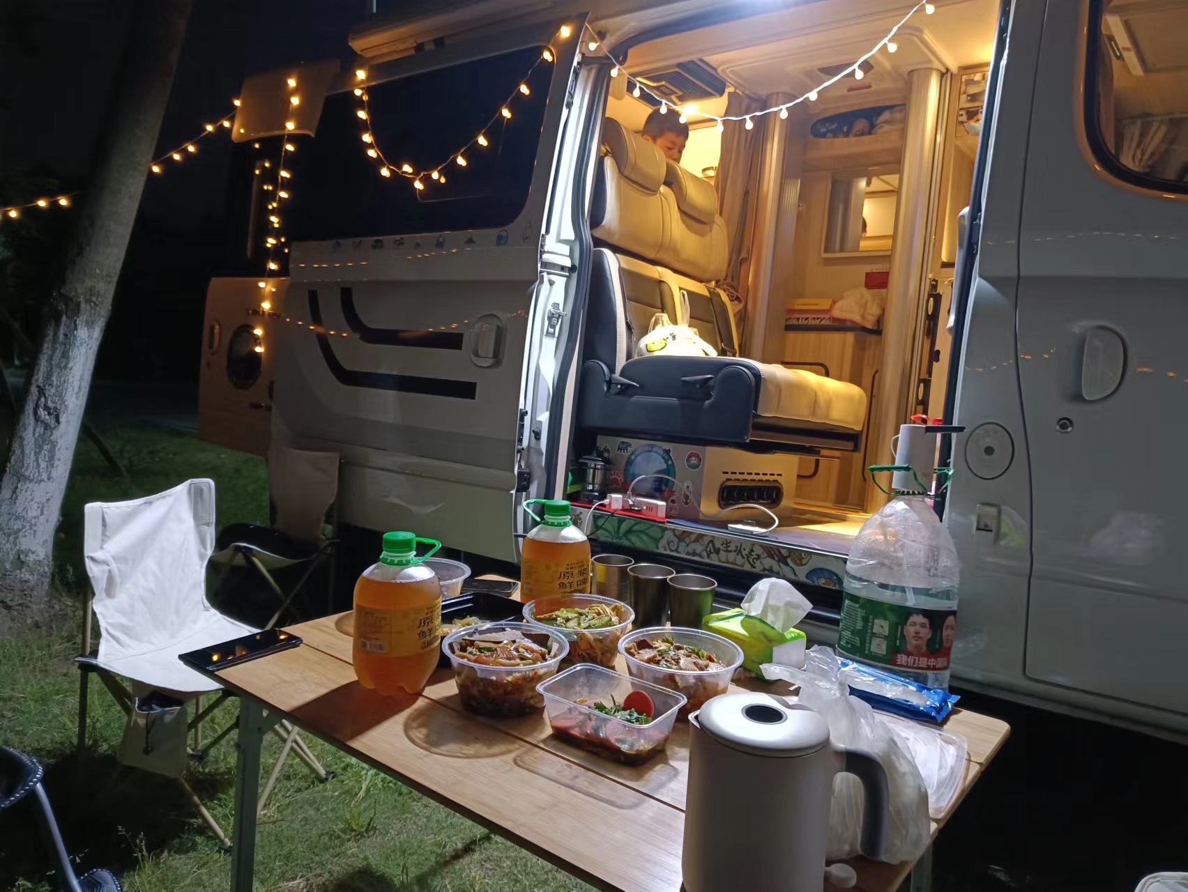 驻车时我们通常会打开遮阳篷,撑起座椅坐下休闲娱乐,听听音乐、泡泡茶这些都要用到220V的电,车子上有两个220V的插座,一个位于车内电磁炉的上方,一个位于车尾床的旁边,用电时我就拖线板从这两个地方取电,比较麻烦