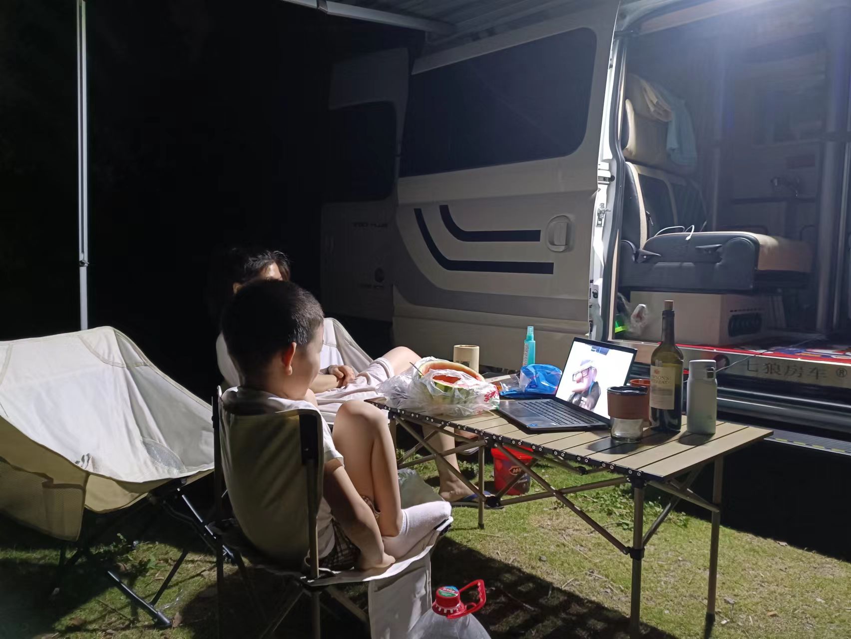 我们傍晚出发天黑到达,打开遮阳棚,点上蚊香,喷好花露水,撑开桌椅板凳,把带过来的零食水果都拿出来,边吃边聊,再跟小朋友一起看了飞屋环游记,可以说是非常轻松惬意了